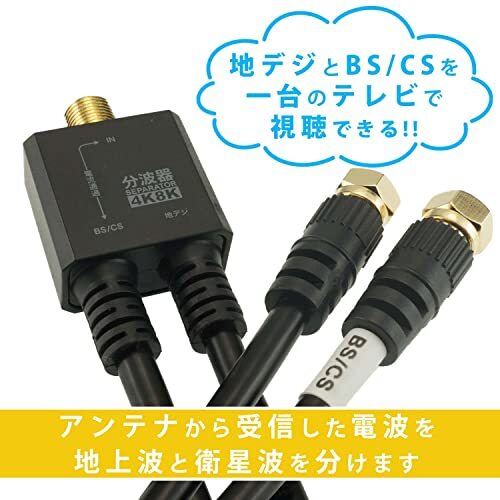 「ホーリック アンテナ分波器 4K8K放送(3224MHz)/BS/CS/地デジ/CATV 対応 ケーブル一体型 20cm ブラック ネジ式コネク」▼4533115065641▼(商品説明)ブラック/20cm/AE-564BK・Size:20cmColor:ブラック・パッケージ個数:1・分波器仕様 ●入力周波数:47~3224(MHz) ●出力周波数:U/V出力端子47~862(MHz) BS/CS出力端子950~3224(MHz)・ケーブル仕様 ●ケーブル規格:S-4C-FB ●ケーブル直径:6mm ●ケーブル長:20cm・●コネクタ規格:F型 ●コネクタ形状:ネジ式(金メッキ仕様) ●コネクタサイズ:W約12.5 x H約12.5 x D約32.75 mm ●インピーダンス:75Ω・袋パッケージ・●期間:1年間 ●生産国:中国●地デジ放送、BS/CS放送をそれぞれ視聴したいときはコレ●地デジ(UHF)と衛星波(BS/CS)を効率よく分け、1台のテレビで地デジ、BS、CSを視聴できます。●4K/8K衛星放送対応●従来の地デジ、BS、CS放送に加えて、最新の4K/8K放送にも対応しています。●便利なケーブル一体型構造●分波器本体と出力側ケーブルが一体型のつくりになっているため、分離型に比べて接続損失を軽減することが可能です。●BSアンテナ電源供給可能