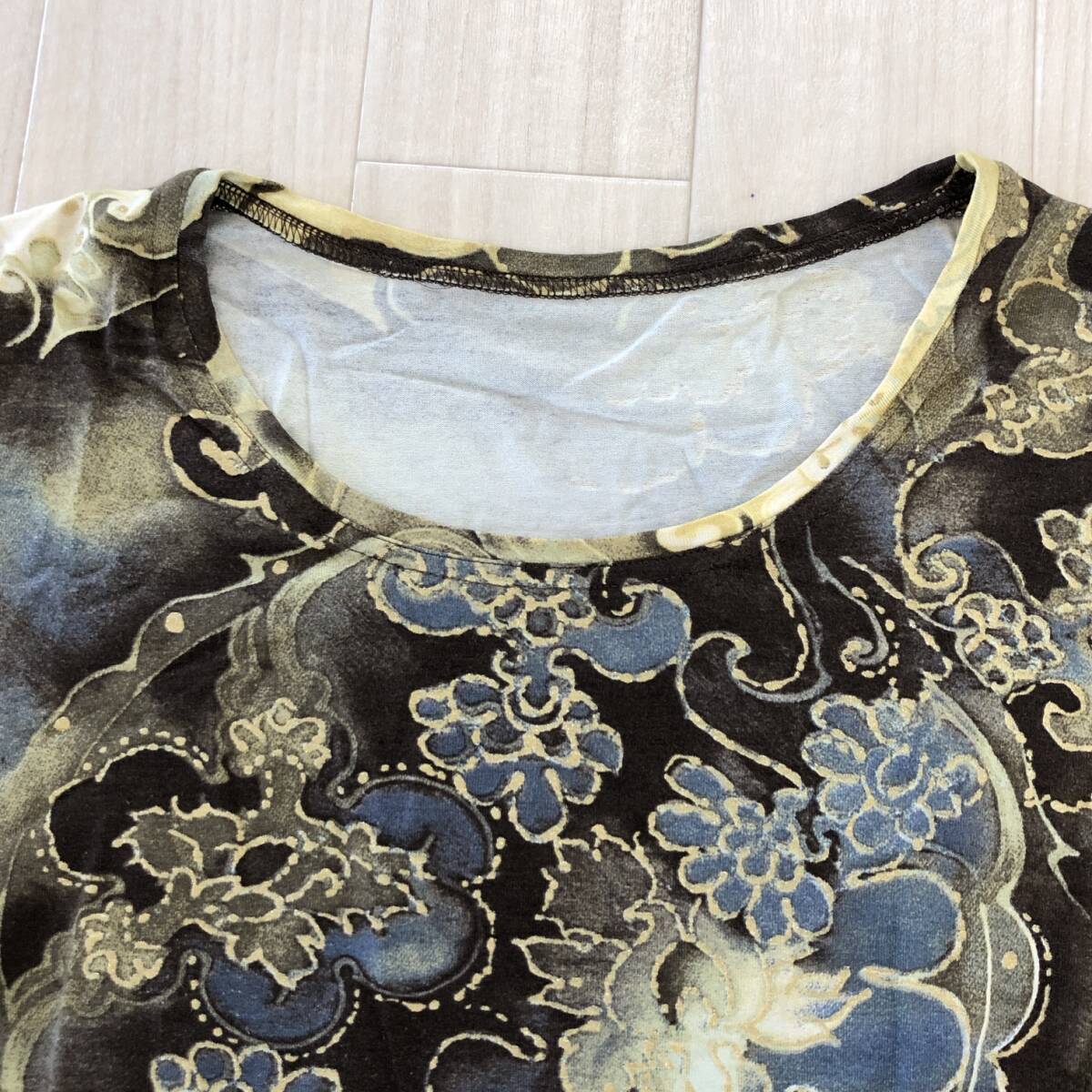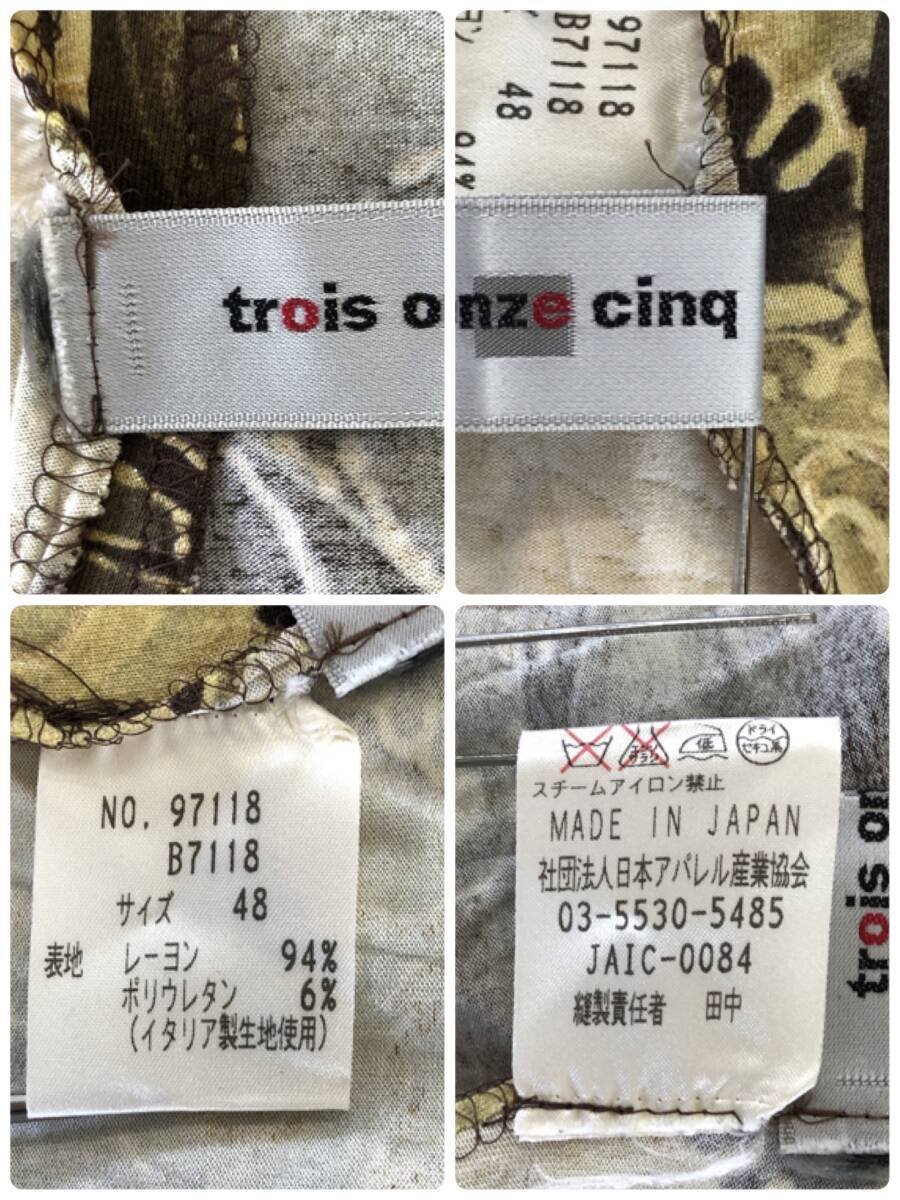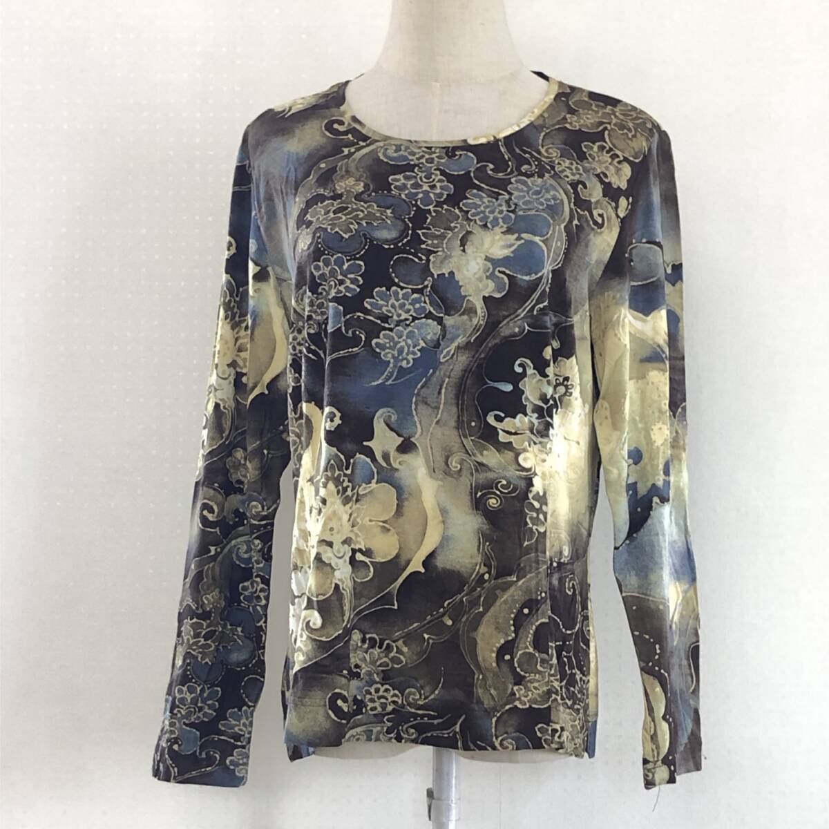 YX1494 美品 trois onze cinq トロワオンサンワ レディース トップス 長袖 日本製 スリット 伸縮性 薄手 48 鮮やか ゴールド 金 花柄 総柄