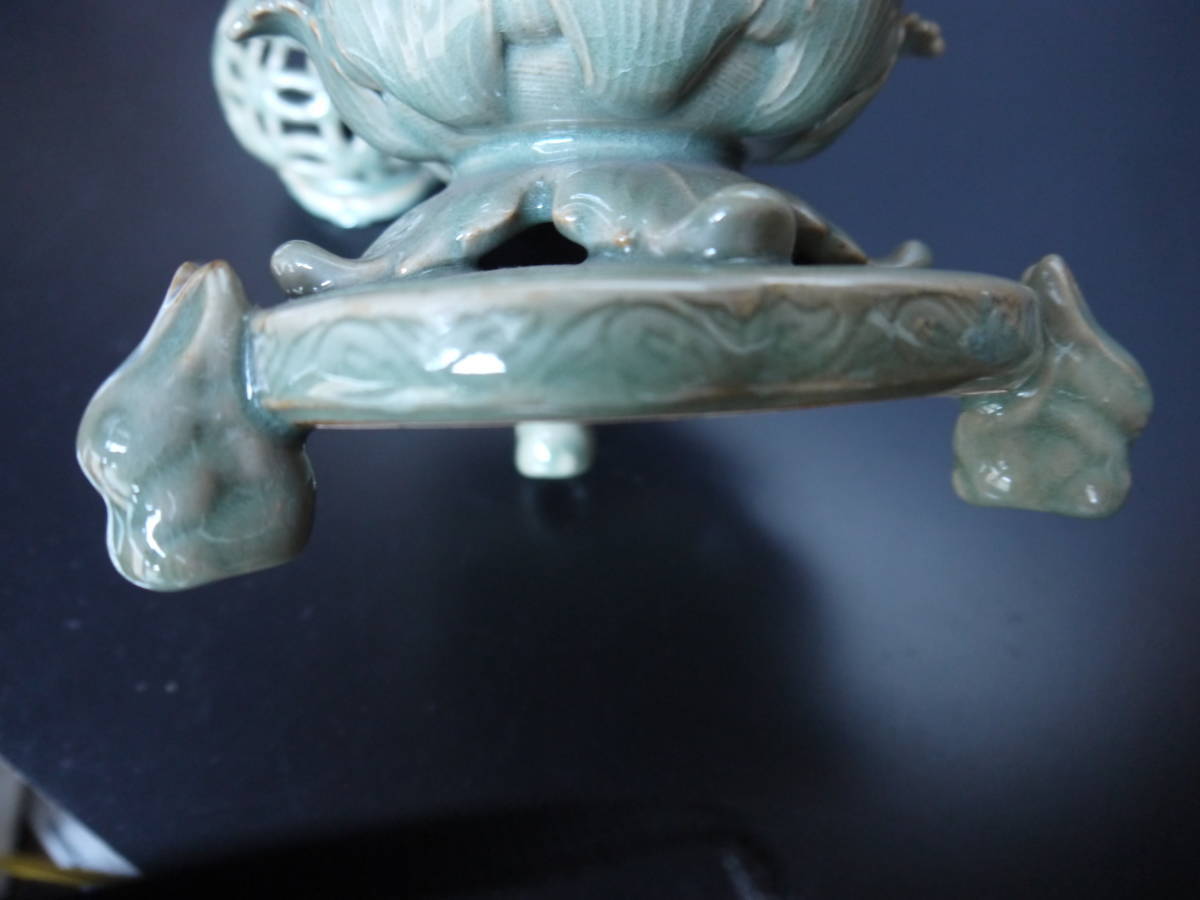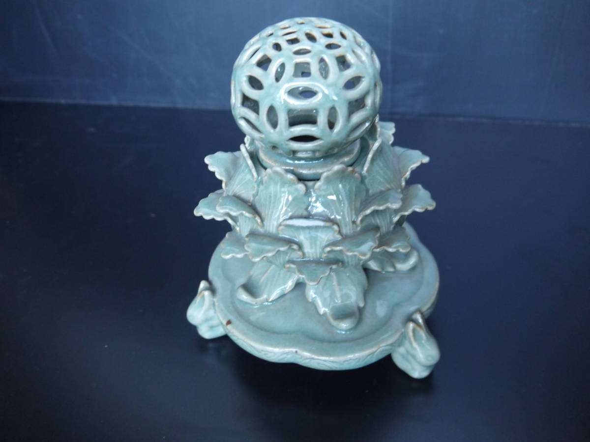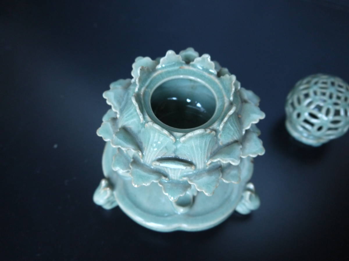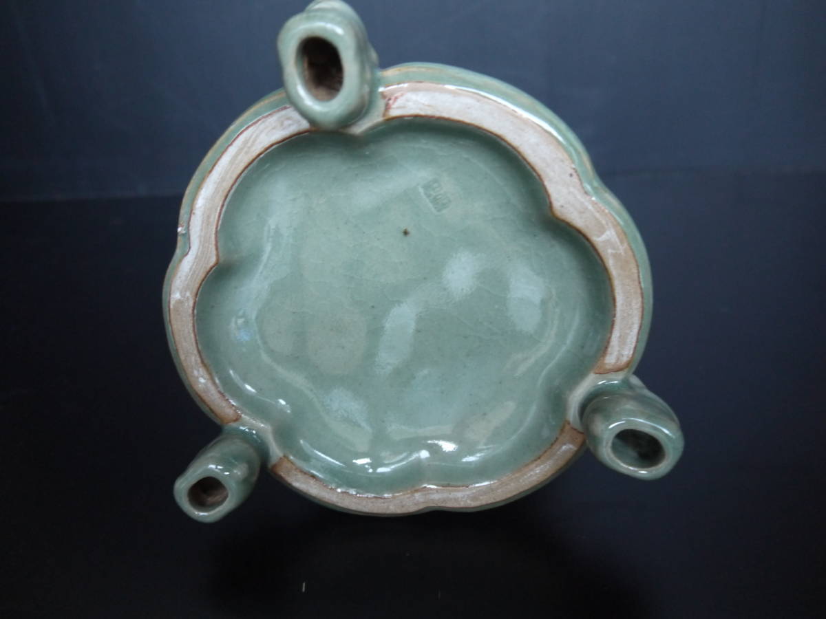☆【A10714】中国古美術 貫入 青釉 三足香炉 青磁香炉 パイナップル?青磁器 時代古物 茶道具 珍品