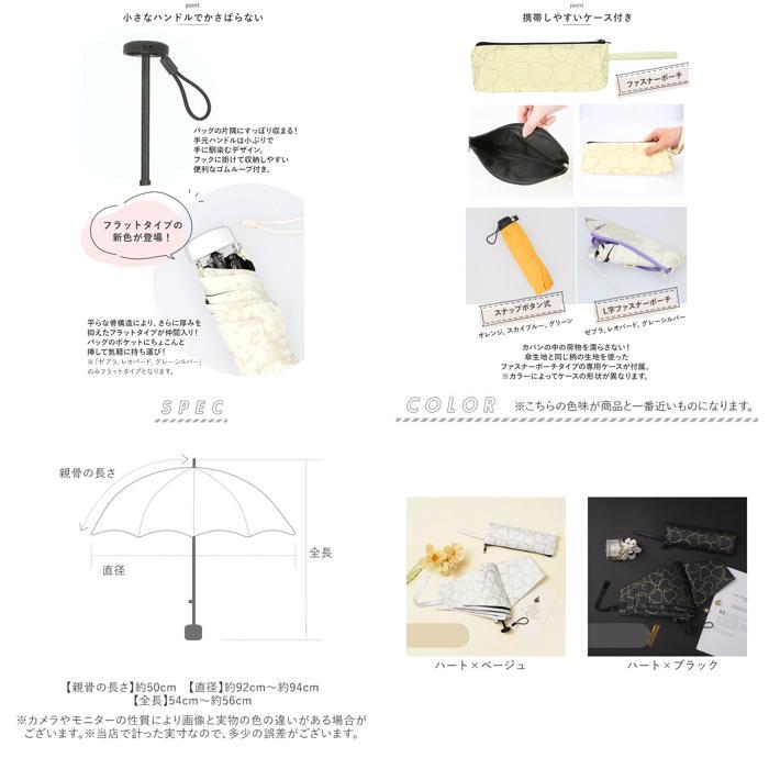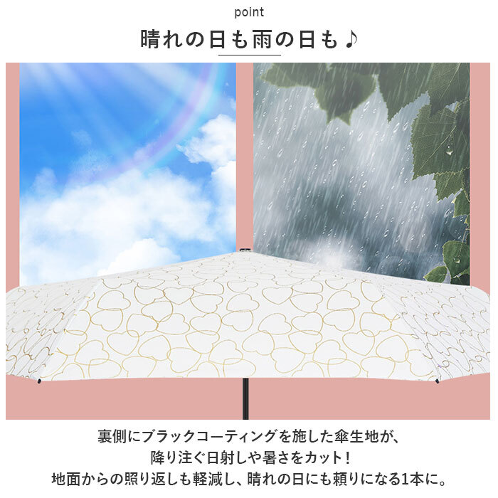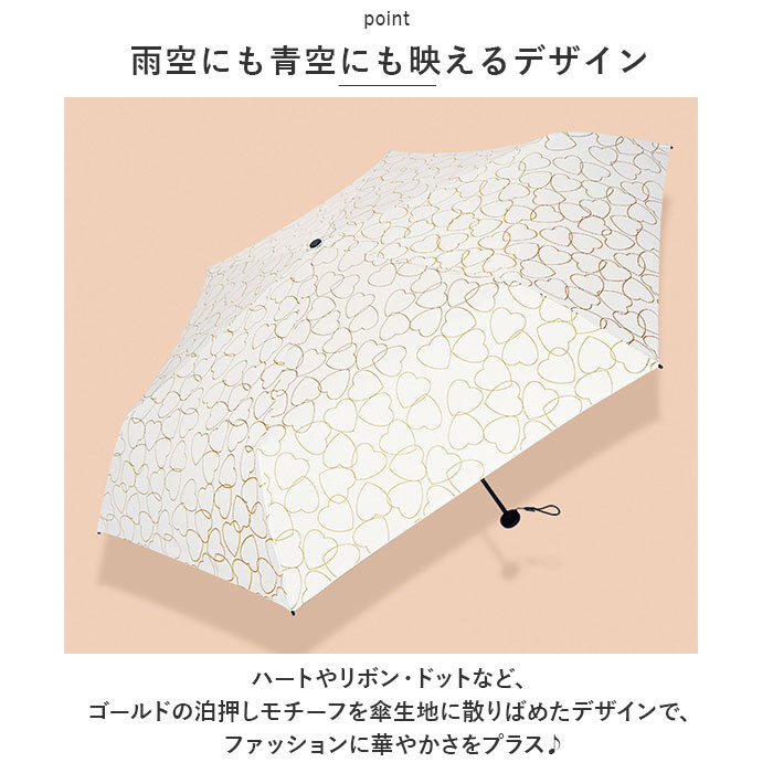 | 商品説明 | ・・いつものバッグにちょこんとしまえるコンパクトサイズ!夏の日差しに負けない「晴雨兼用折りたたみ傘(親骨50cmタイプ)」が新登場。 ・【ミニマム派に嬉しいサイズ】 ・折りたたみ時の大きさ約20cm、重さわずか160gのコンパクト設計。小さめバッグの中でもかさばらない、ミニマム派に嬉しいサイズ感。(※折りたたみ時の大きさ、重さに傘袋は含まれていません。) ・【晴れの日も雨の日も♪】 ・裏側にブラックコーティングを施した傘生地が、降り注ぐ日射しや暑さをカット!地面からの照り返しも軽減し、晴れの日にも頼りになる1本に。 ・【軽くて、しなやか】 ・スリムで軽量なアルミ素材に、グラスファイバーを組み合わせたハイブリッド構成の親骨パーツが強い風をしなやかに受け止めるヒミツ。 ・【スムーズな手開きタイプ】 ・混雑した場所でも傘生地をスムーズかつ、安全に開くことのできる手開き式。 ・【安全カバー付きで安心】 ・ハジキ部分には爪や指を挟む心配のない安全ろくろカバー付きなので、ネイルアートをした指先もしっかりガード。 ・【たたむ時も手間取らない!】 ・留めバンドには、玄関に入るときに傘生地がサッとまとめやすい面ファスナーバンドを採用。 ・【コロンと小さなハンドル】 ・手元ハンドルは、コンパクトに持ち運べるようにフラットな円盤状にデザイン。フックに掛けて収納しやすい便利なゴムループ付き。 ・【携帯しやすいケース付き】 ・カバンの中の荷物を濡らさない!傘生地と同じ柄の生地を使ったファスナーポーチタイプの専用ケースが付属。 ・【雨空にも青空にも映えるデザイン】 ・ハートやリボン・ドットなど、ゴールドの泊押しモチーフを傘生地に散りばめたデザインで、ファッションに華やかさをプラス♪ |