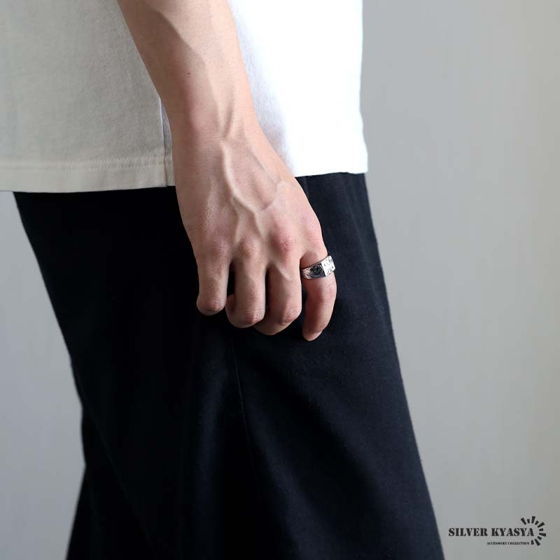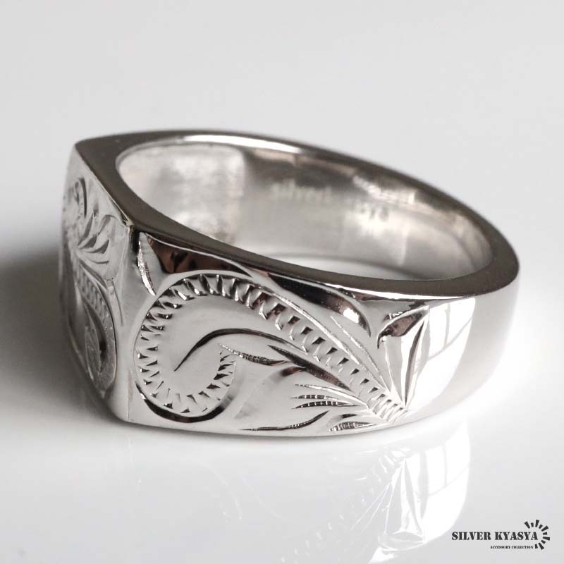 繊細に刻まれたハワイアン柄が映える印台リング。台座はスクエアでスタイリッシュな雰囲気を演出。広めの幅で存在感があり、シンプルな装いにアクセントとして発揮してくれます。