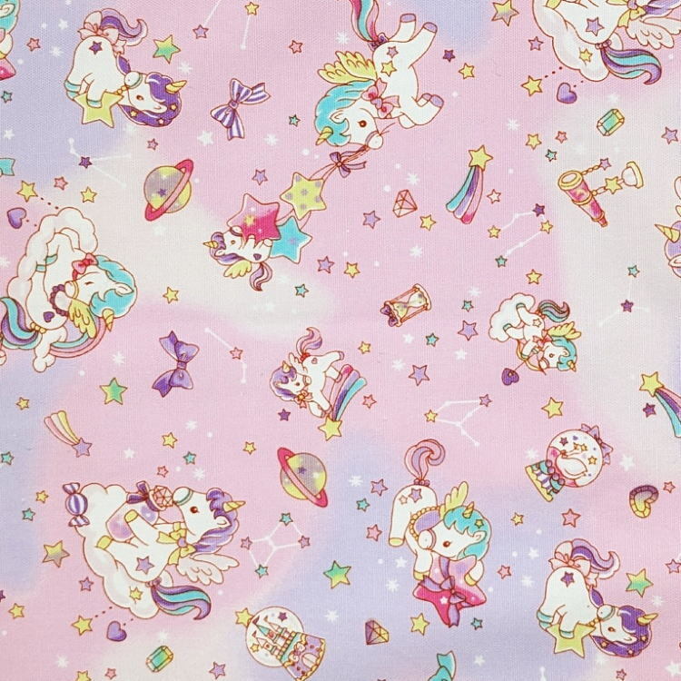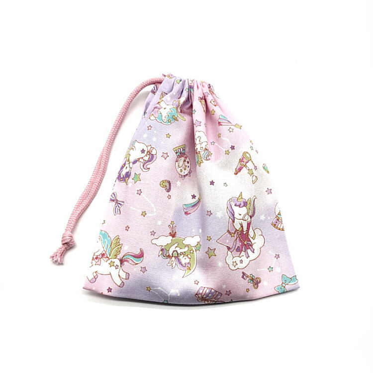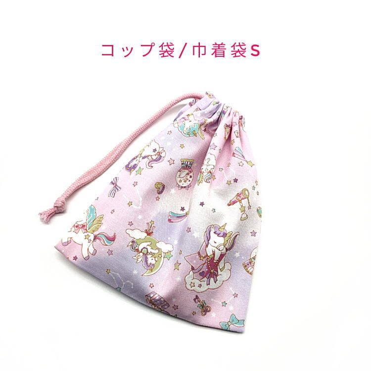 コップ袋・巾着袋S【星空ユニコーン柄 ピンク】マチ無し 日本製 ランチ袋 ナフキン入れ ポーチ 給食袋 収納袋 女の子 ペガサス 星座 リボン