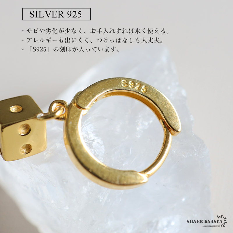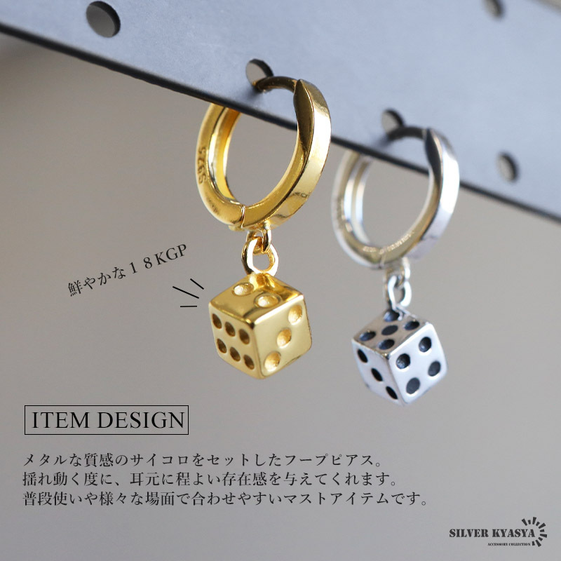 | 商品概要 | ■ITEM DETAIL メタルな質感のサイコロをセットしたフープピアス。揺れ動く度に、耳元に程よい存在感を与えてくれます。普段使いや様々な場面で合わせやすいマストアイテムです。 ■SILVER925素材 シルバー925は、銀含有率(純度)92.5%を示し、一般的に純銀として扱われています。サビや劣化等がほとんどなく金属アレルギーも出にくいとされており、アクセサリーとして重宝される金属です。 |