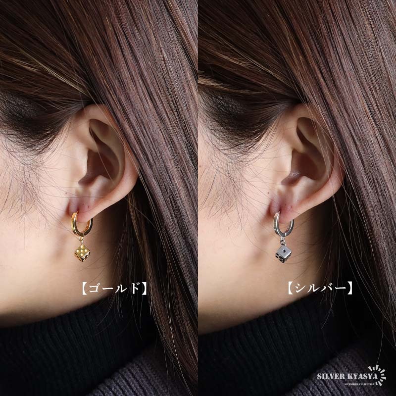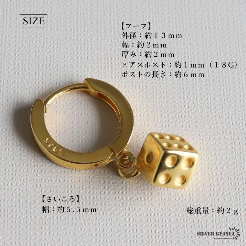 | サイズ | さいころ:幅約5.5mm フープ:外径:約13mm、幅:約2mm、厚み:約2mm ピアスポスト:約1mm(18G) ポストの長さ:約6mm 総重量:約2g |