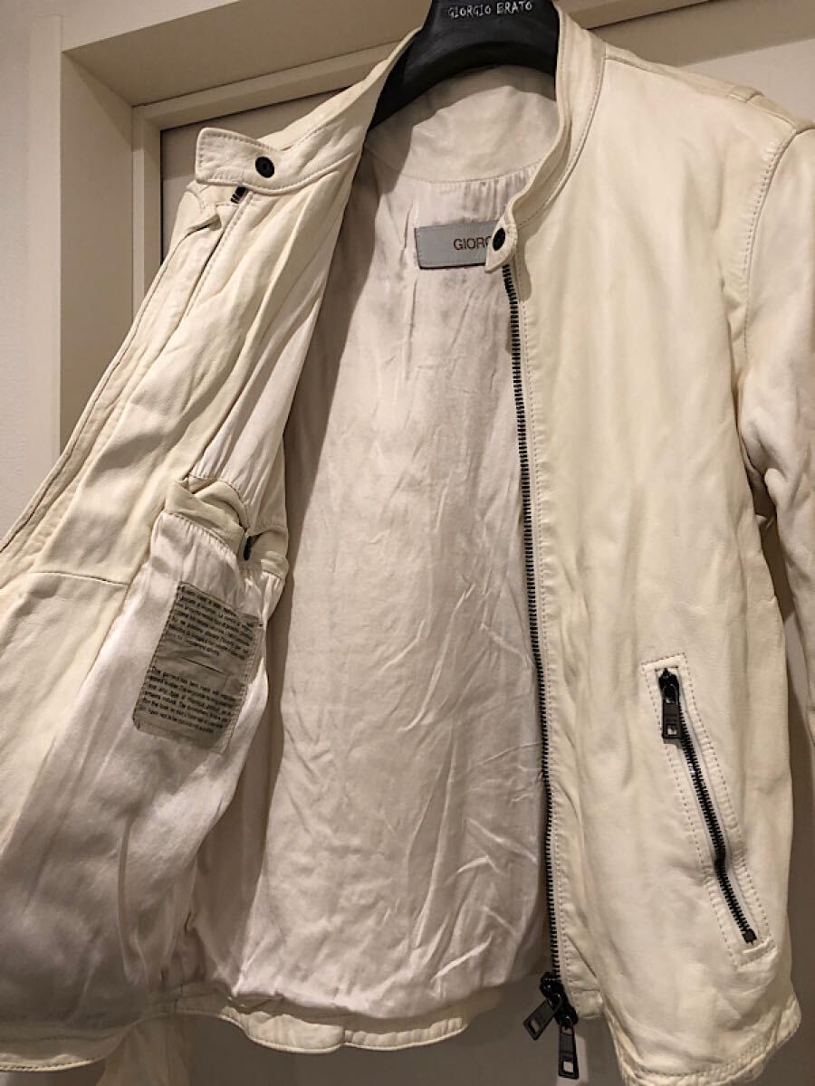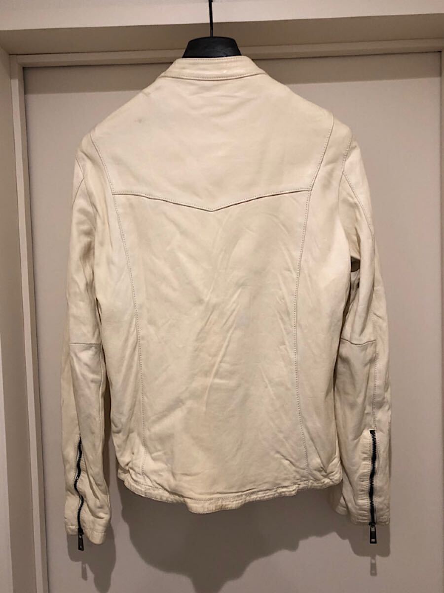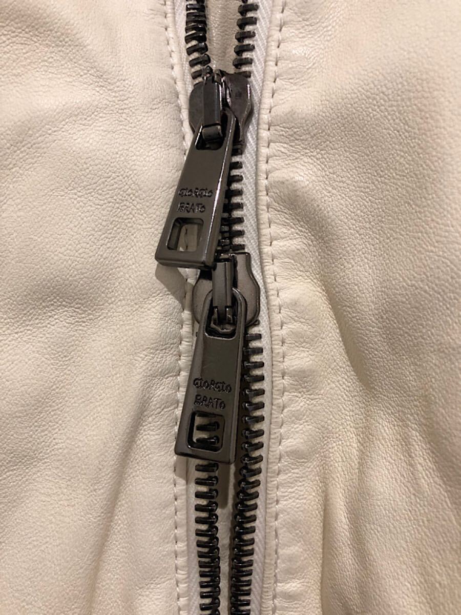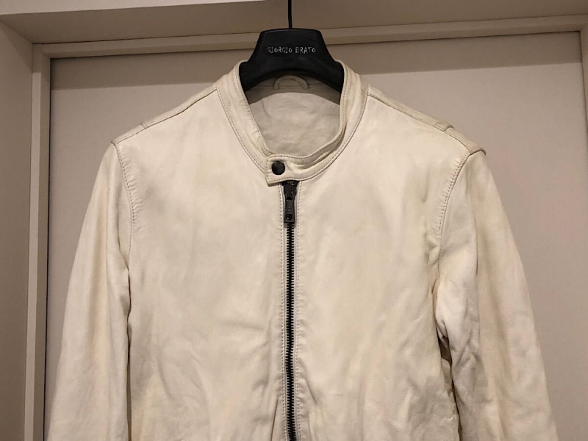 特に強い使用感がある状態ではありませんが、ホワイトレザーですので数カ所に汚れがございます。また、首元のスナップボタンにg.bratoで多い青サビが付着しております。(画像参照)