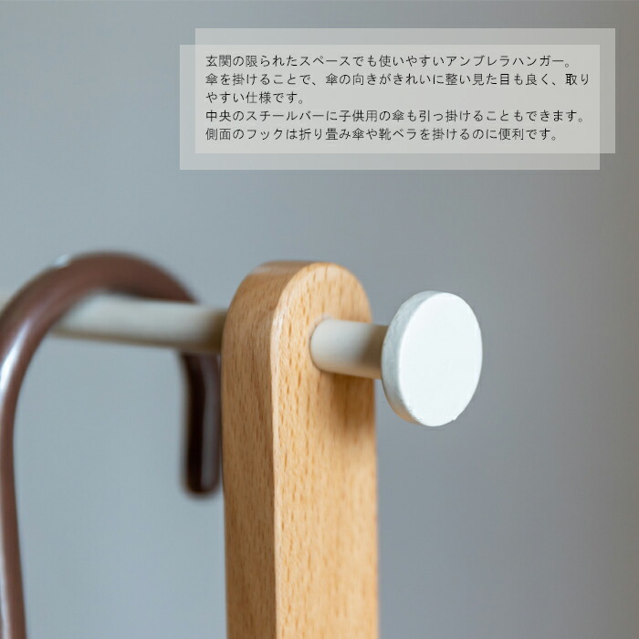 | 玄関の限られたスペースでも使いやすいアンブレラハンガー。 傘を掛けることで、傘の向きがきれいに整い見た目も良く、取りやすい仕様です。 中央のスチールバーに子供用の傘も引っ掛けることもできます。 側面のフックは折り畳み傘や靴ベラを掛けるのに便利です。 |