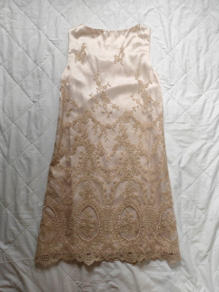 〜シャンパンゴールドの刺繍と首元のスパンコールがキラキラして魅力的なベージュピンクのパーティードレスです〜