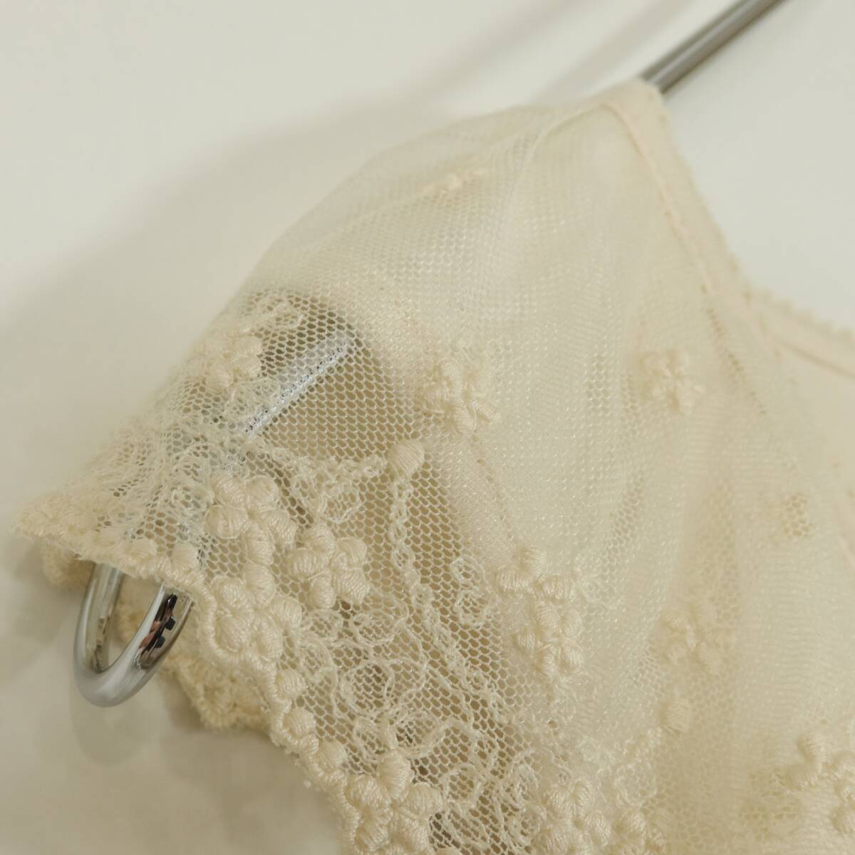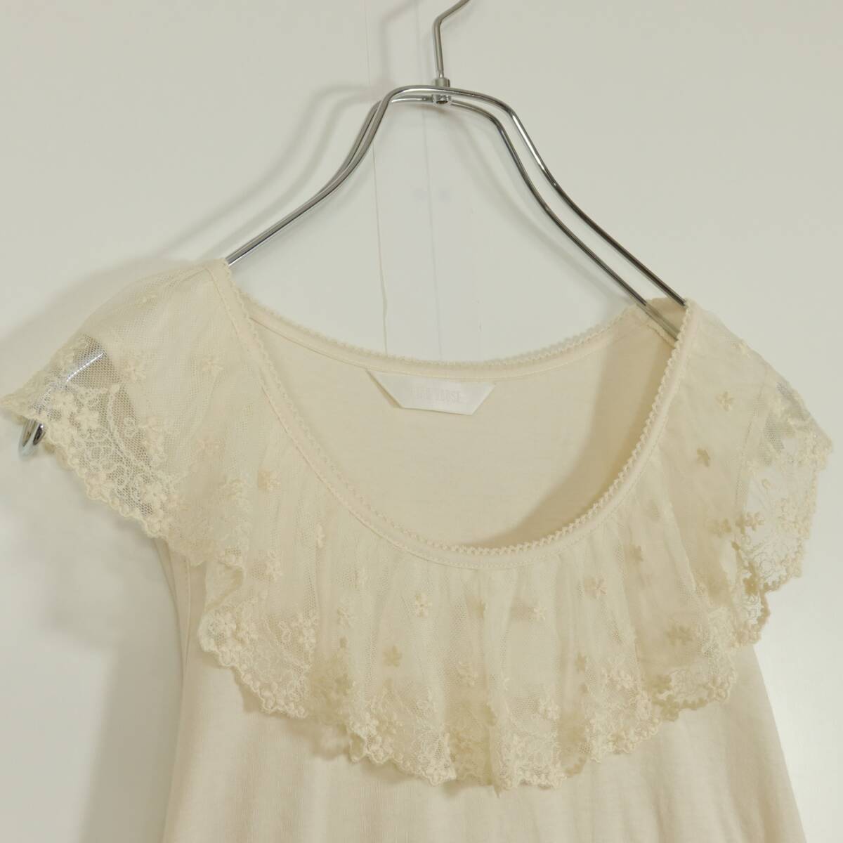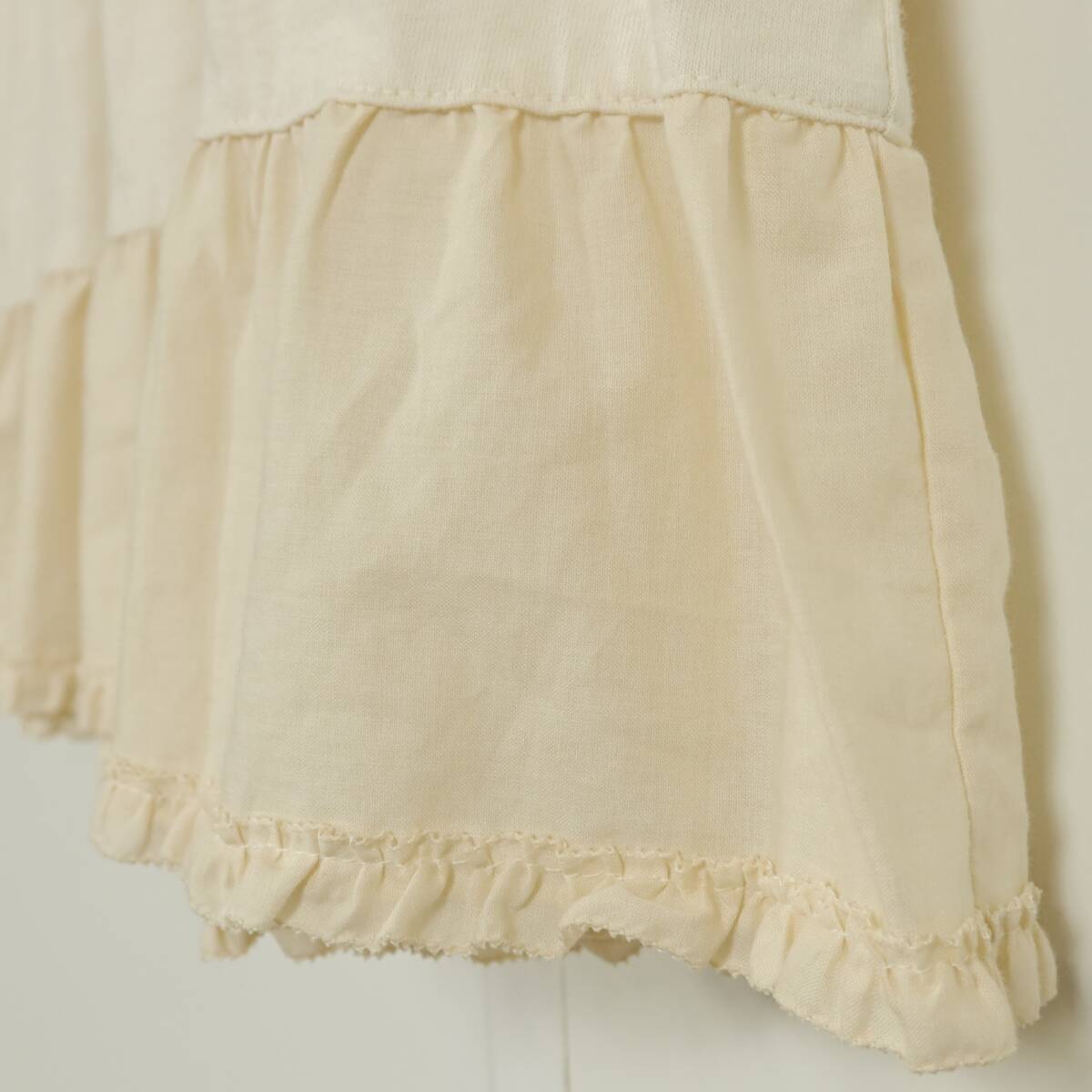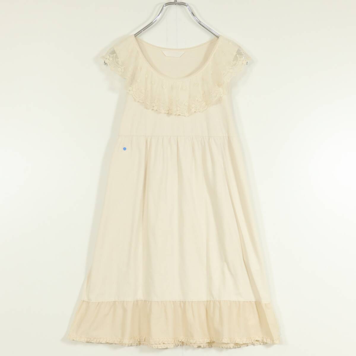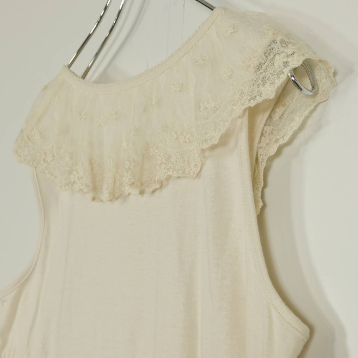 | 商品説明 | 【実寸約】バスト88着丈77(cm) 【サイズ表記】 なし。実寸をご参照くださいませ。 【素材】 綿100% 【状態】普通の使用感のあるお品物 薄シミ少々あり 【デザイン】アイボリー系 肩回りにチュールレースがついたノースリーブワンピースです。 薄手/無地・レースにお花の刺繍付き♪カットソー素材♪ |