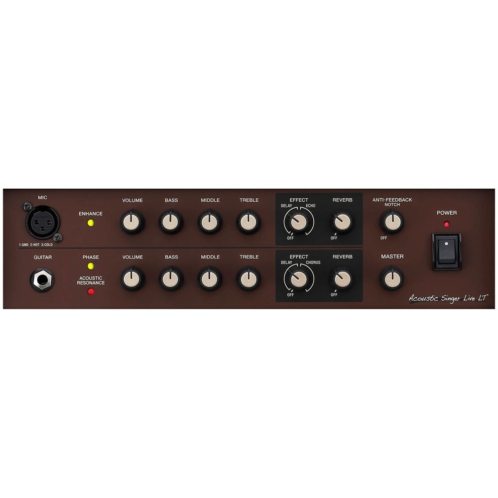 エレクトリック・アコースティック・ギターの低音域を原因としたハウリングに多くのプレイヤーが頭を悩ませていますが、Acoustic Singer Live LTはこの問題を素早く簡単に解決することができます。ギター・チャンネルのPHASEスイッチは、位相を反転させることでハウリングが起こりにくい状態を作り出すことができ、さらにANTI-FEEDBACKノブを活用して、原因となっている周波数帯をノッチ・フィルターによって抑制できるので、より効果的にハウリングを抑えることが可能です。
