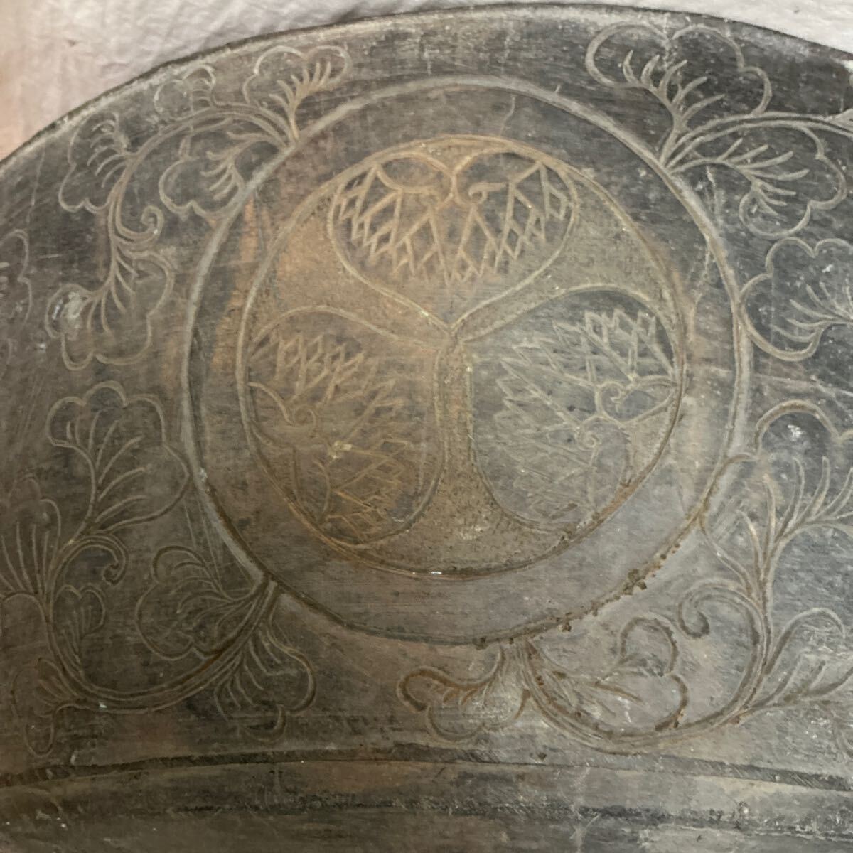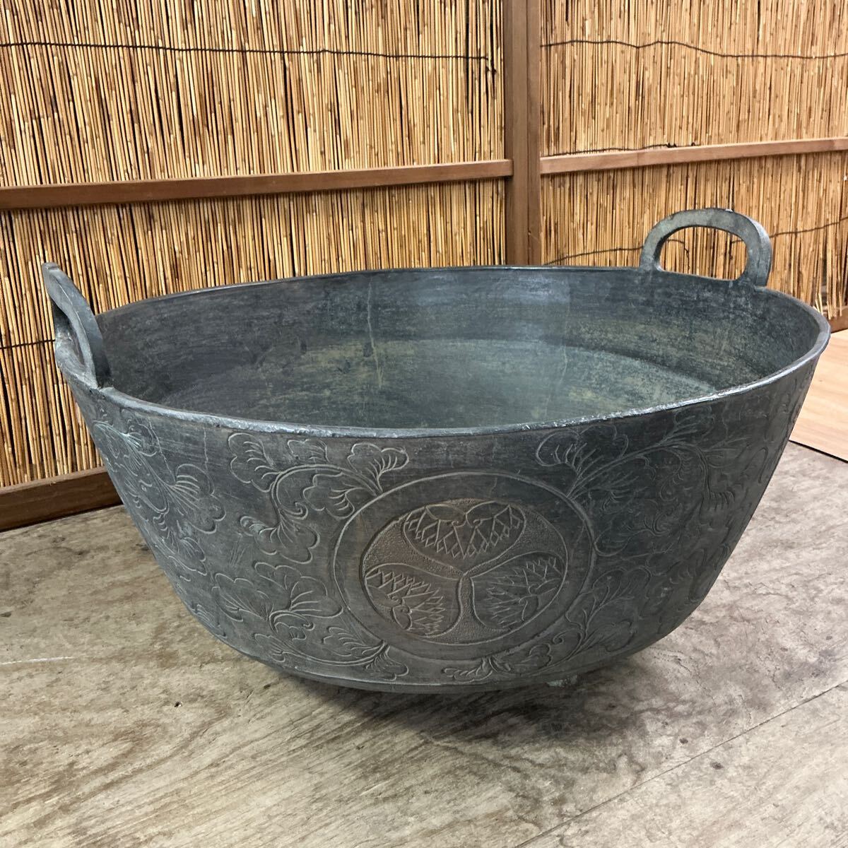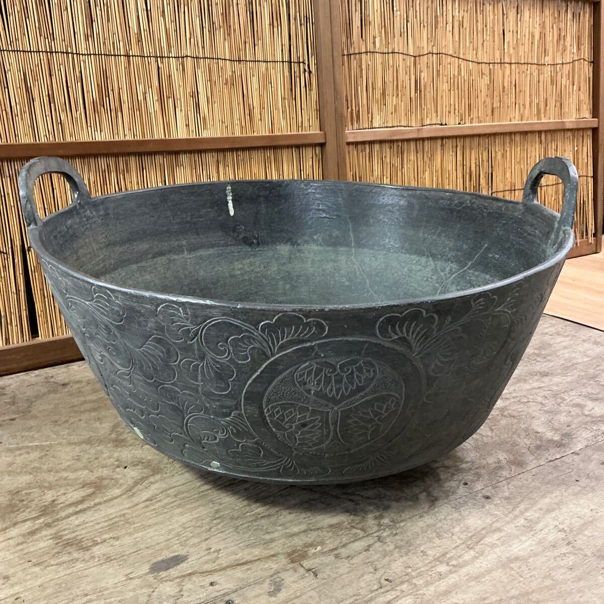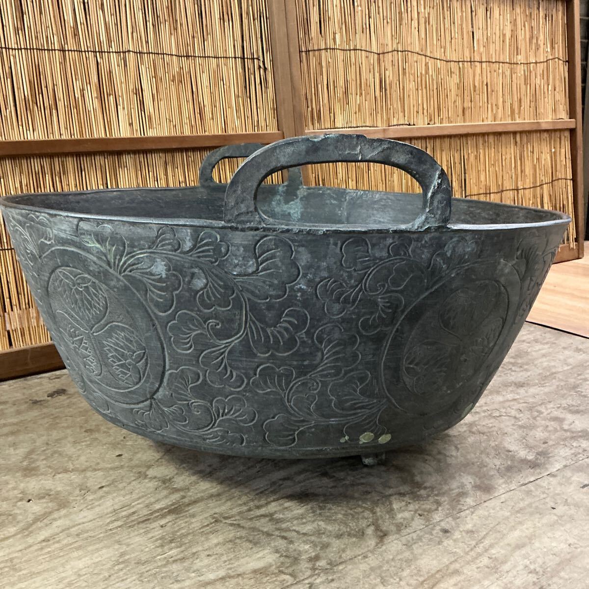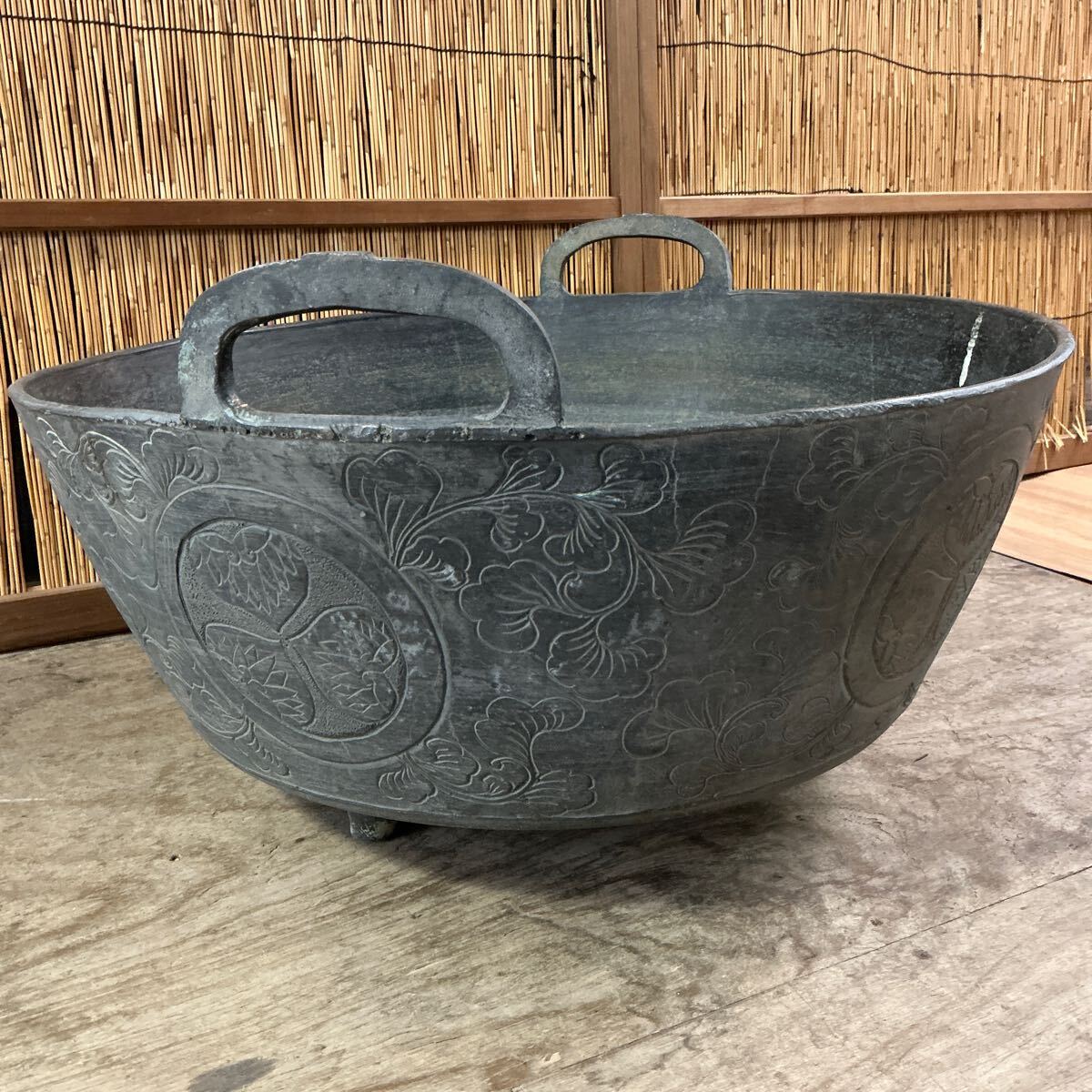 希少品 時代 銅製 特大 三つ葉葵紋刻 三足 手付水鉢 です。