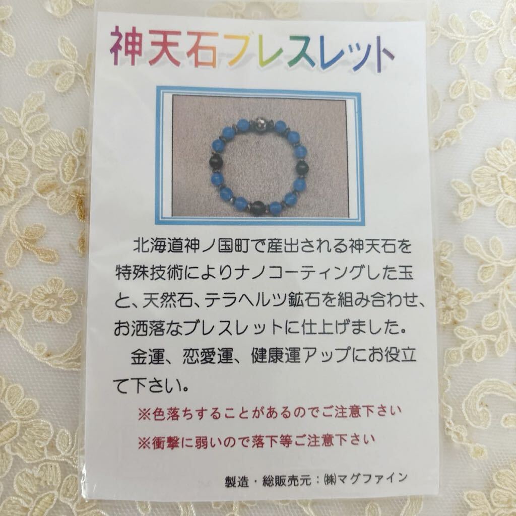 詳細説明 | 北海道神ノ国町で産出される神天石を特殊技術によりナノコーティングした玉と、天然石(ラピスラズリ)、テラヘルツ鉱石を組み合わせた、お洒落なブレスレット。 金運、恋愛運、健康運アップにお役立て下さい。 |