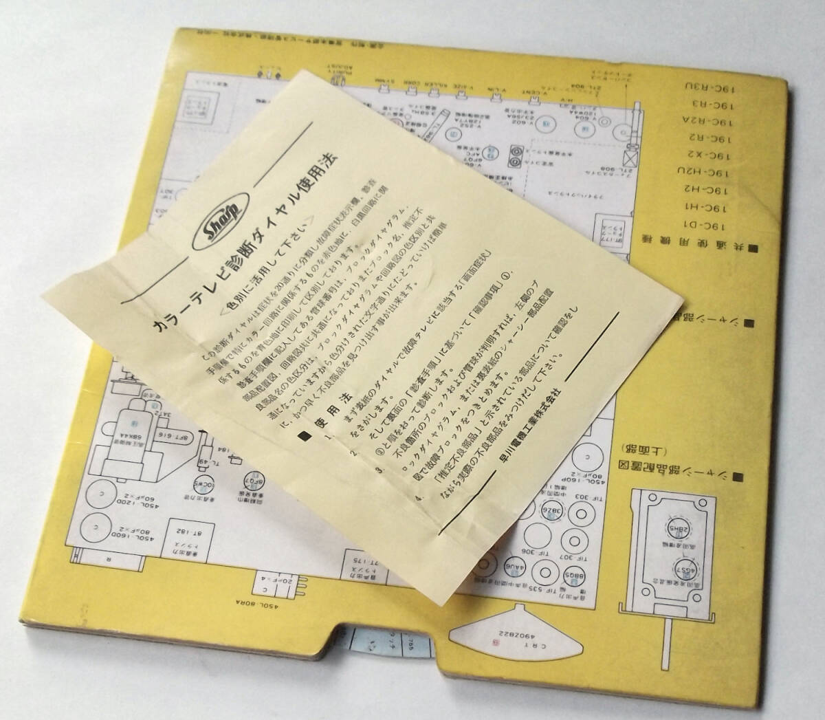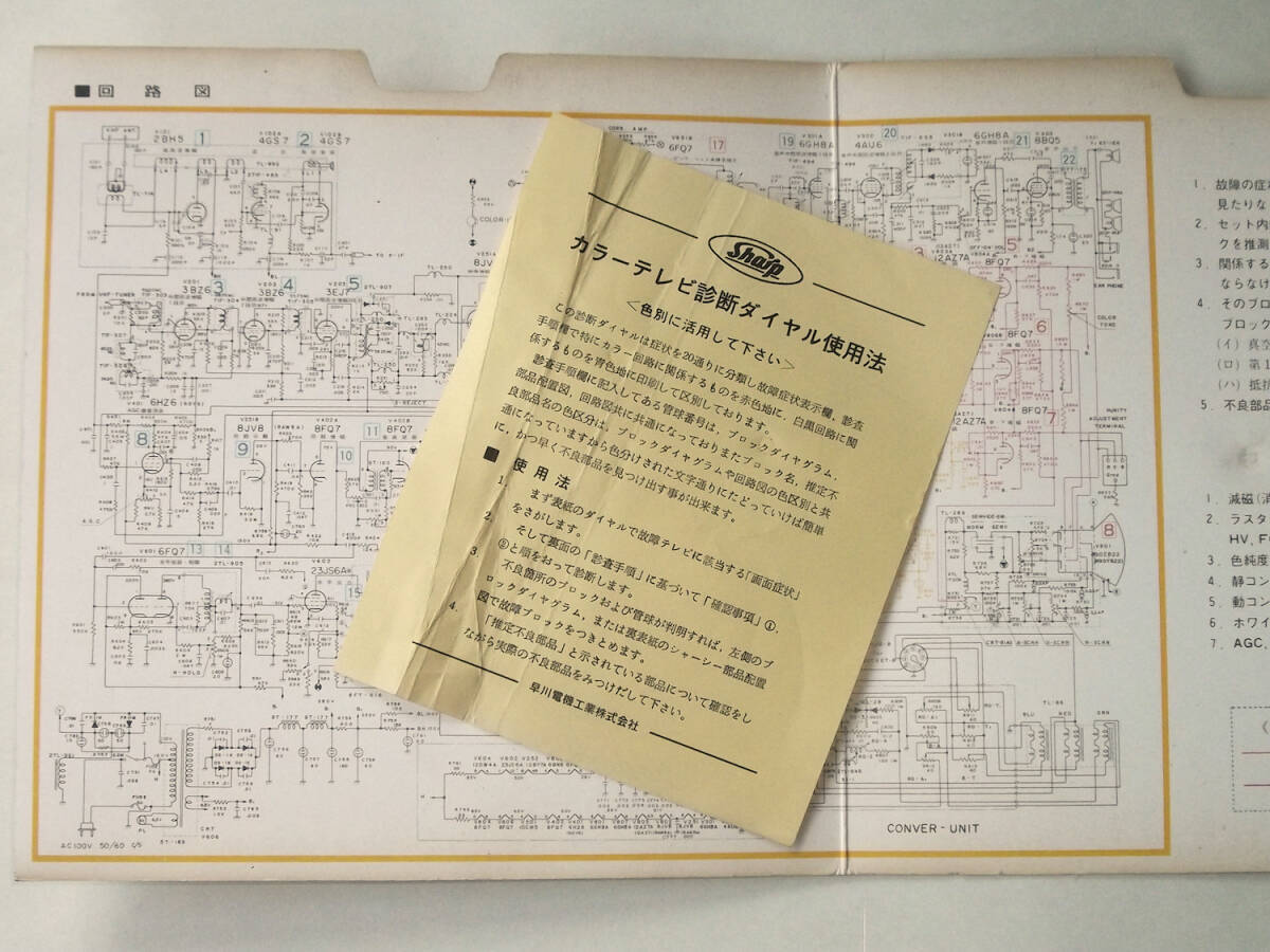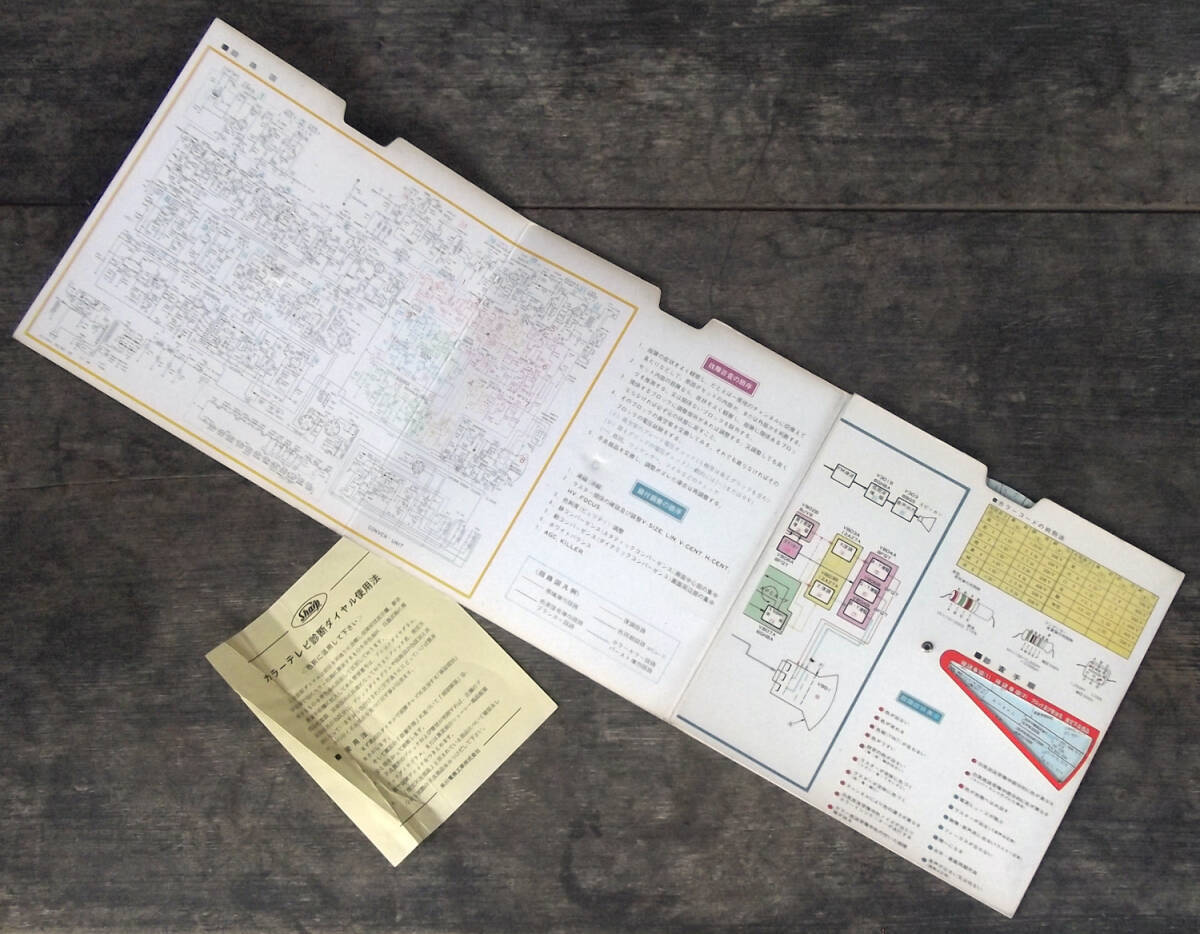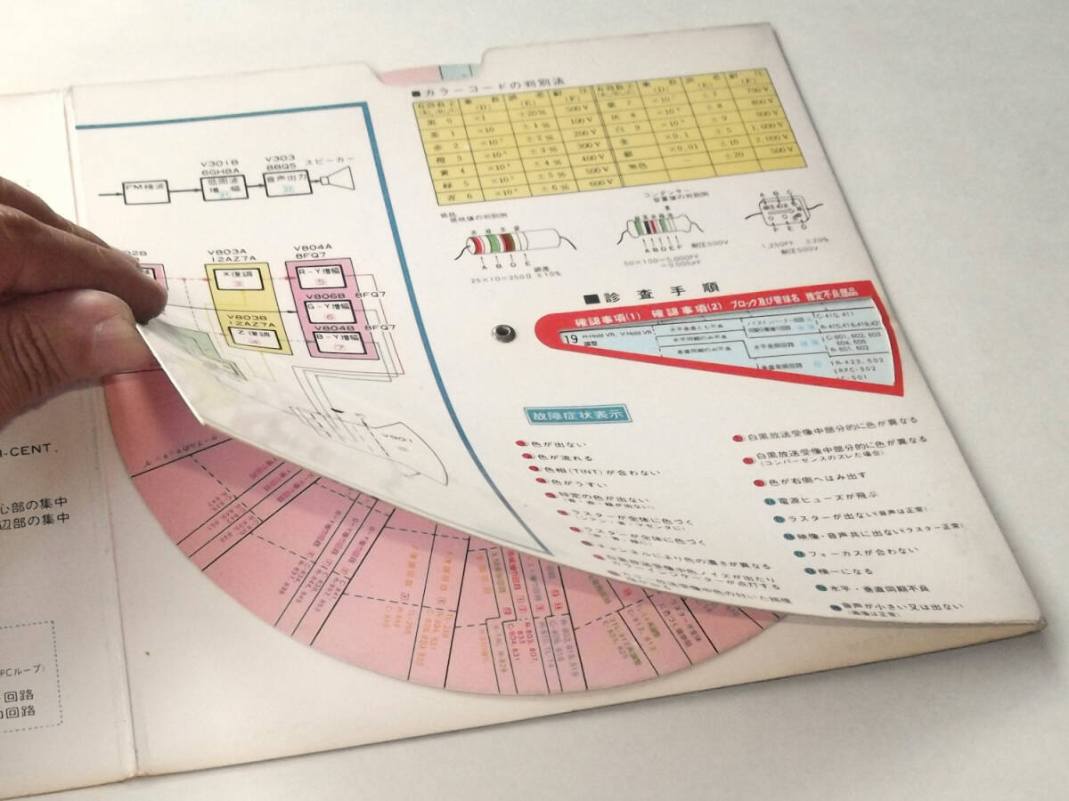 昭和の見開きの印刷物です。テレビ購入時についてくる非売品ではないかと思わましたが、発行年や型番の記載がみあたらずいつごろのどのテレビ用なのかこちらで不明でした、お詳しい方画像の方をご参照ください。中に紙製の円盤があり、回して表側の故障症状に合わせると、内側に審査手順が表示されるしくみになっています。説明プリント1枚付き。