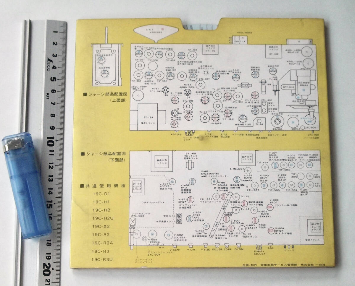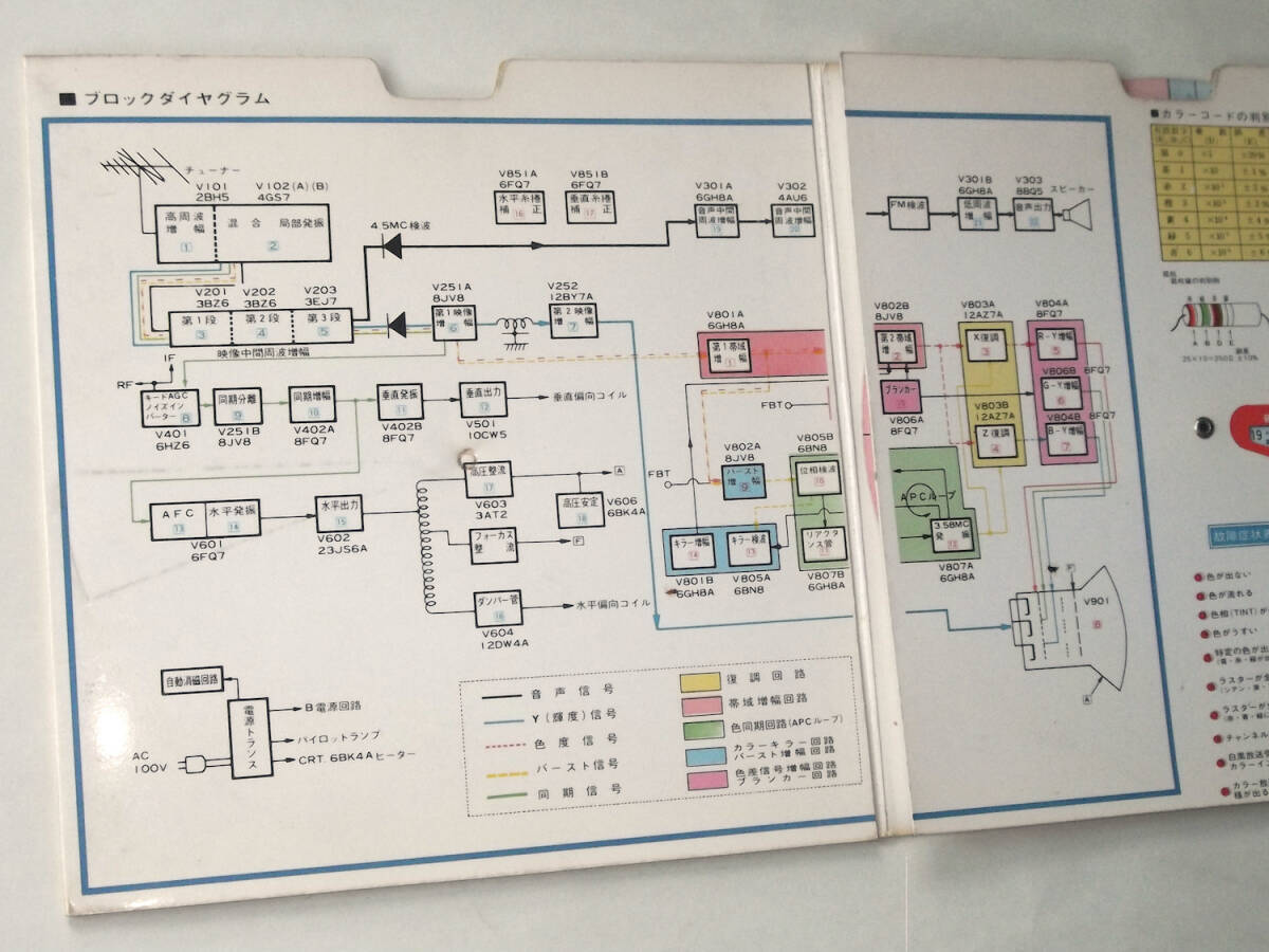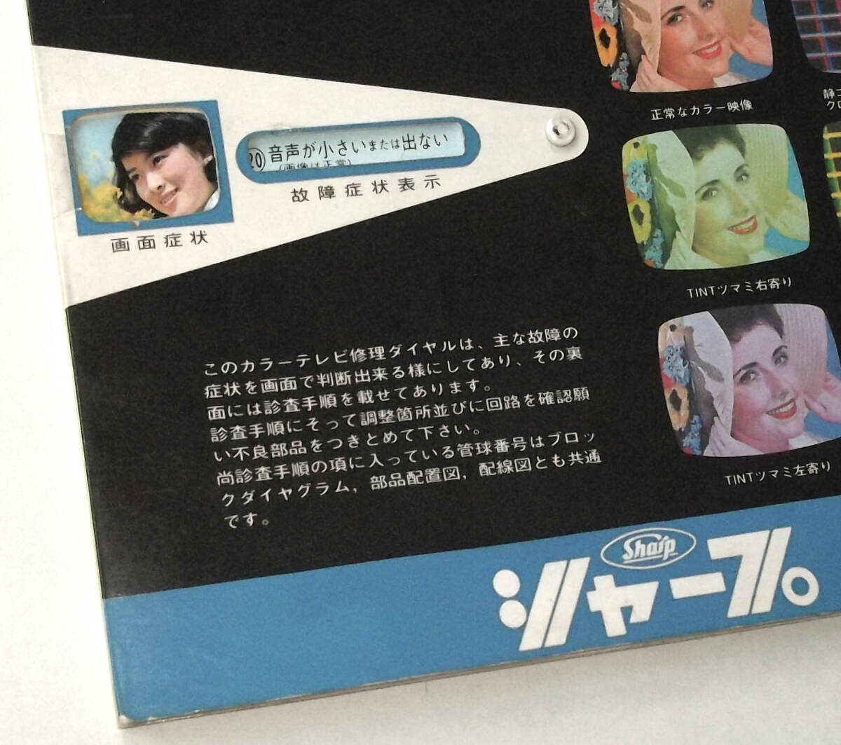 昭和の見開きの印刷物です。テレビ購入時についてくる非売品ではないかと思わましたが、発行年や型番の記載がみあたらずいつごろのどのテレビ用なのかこちらで不明でした、お詳しい方画像の方をご参照ください。中に紙製の円盤があり、回して表側の故障症状に合わせると、内側に審査手順が表示されるしくみになっています。説明プリント1枚付き。