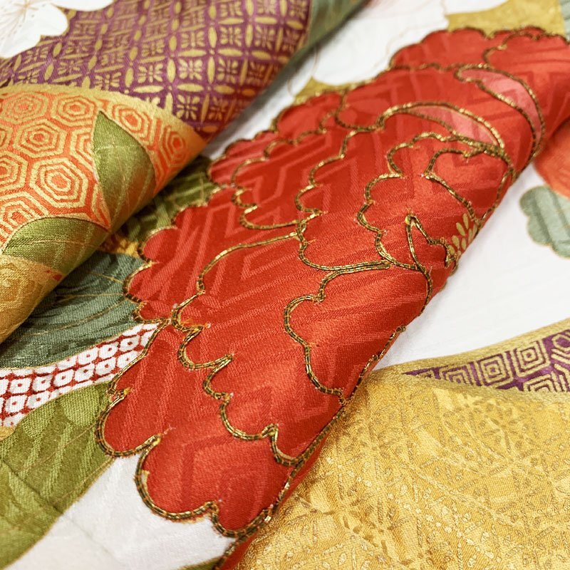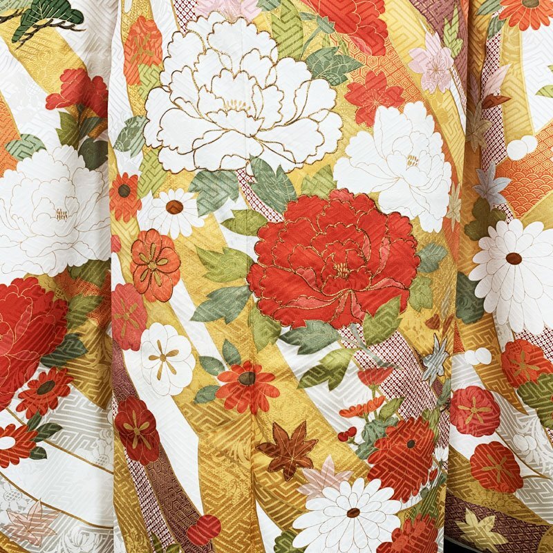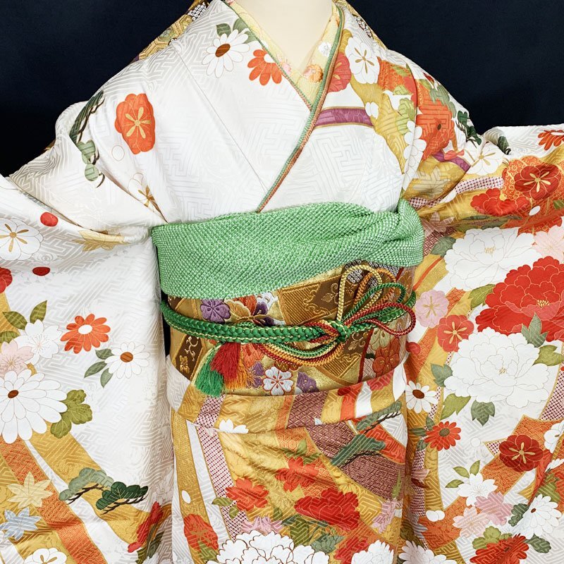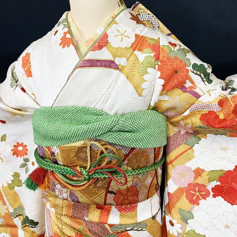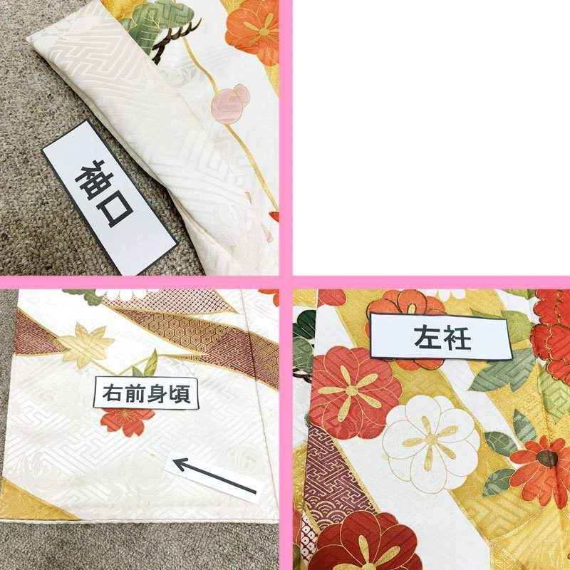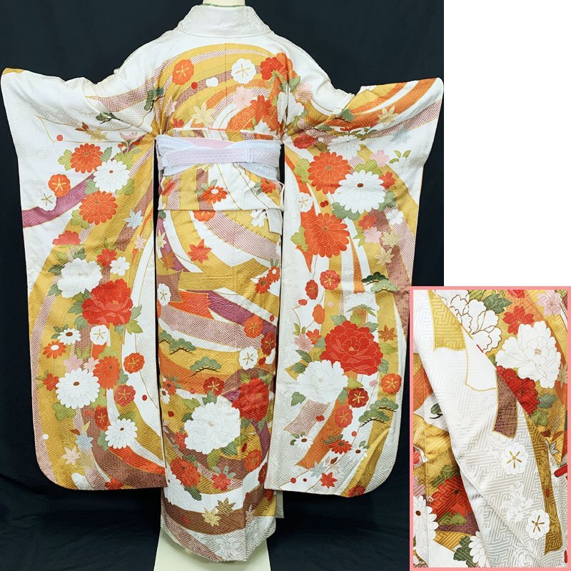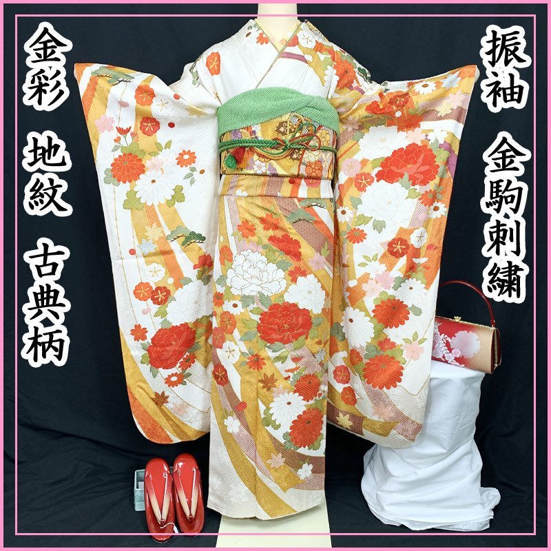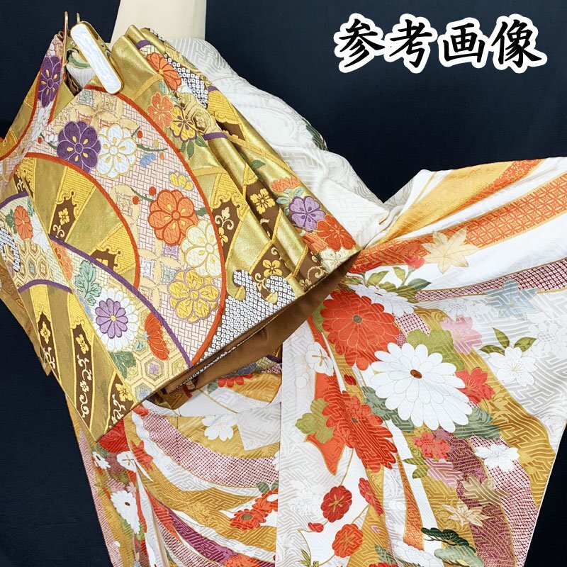 ☆人気の白地 振袖 金駒刺繍 金彩 地紋 古典柄 吉祥文様 オフホワイト☆美品 成人式 結婚式 (No.id) オフホワイトの地に、大きな束ね熨斗を背にした牡丹や菊などの花が描かれた振袖です。金駒刺?や金彩が施されています。 こちらの商品は振袖のみで、画像の袋帯411y36、重ね衿、帯締め、帯揚げは参考商品ですが、在庫がある場合に限り+12,000円で振袖とセットでお譲りすること可能です。刺繍半衿は+2,000円。草履バッグセット406v42は参考商品です。 袖口に使用汚れと右前身頃の裾付近に小シミがございますが、ご着用の際には見えません。ほか左衽のアクは遠目には分からず、特に目立つようなダメージはなく美品です。 【素材】正絹 【色】オフホワイト、白、辛子色 *モニターによって色味は実際と異なる場合がございます。 【サイズ】
