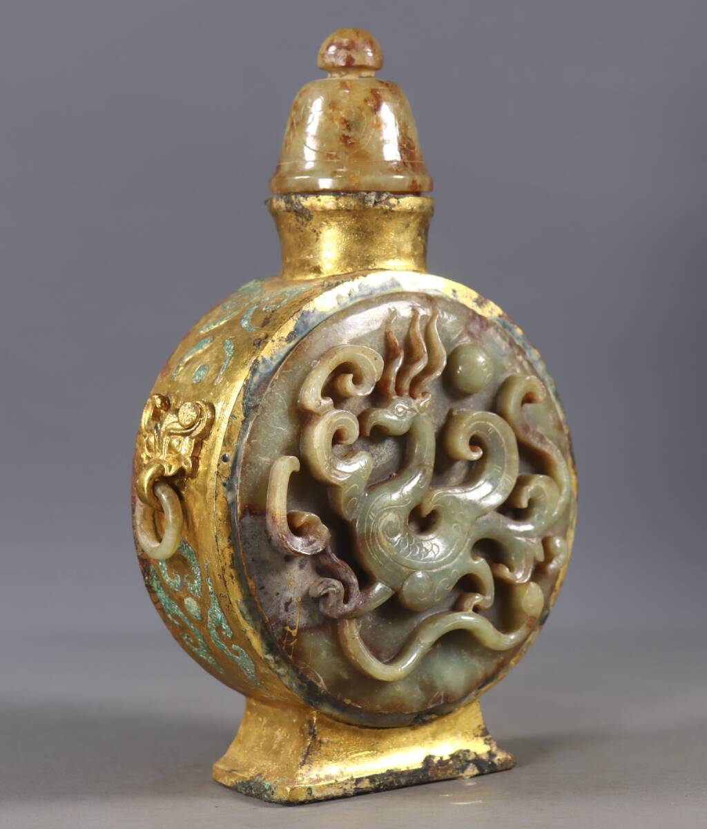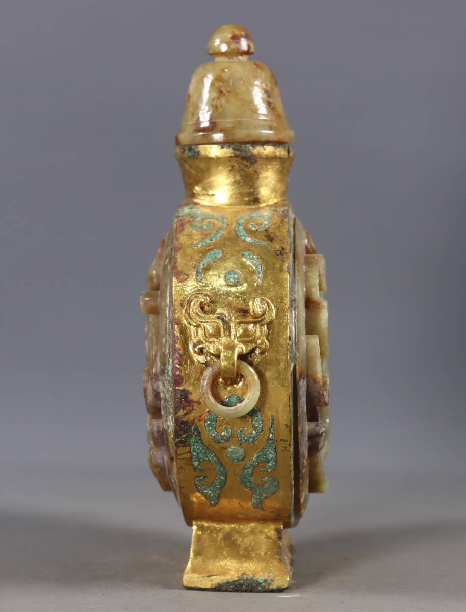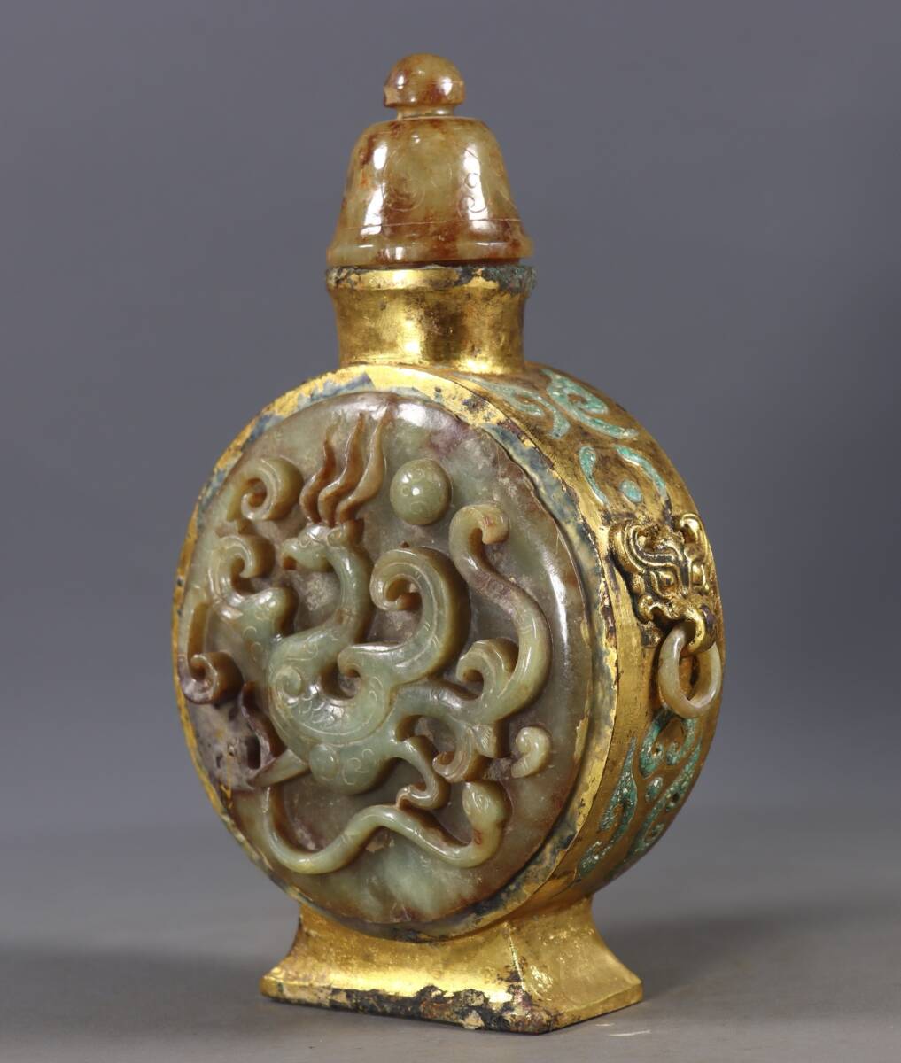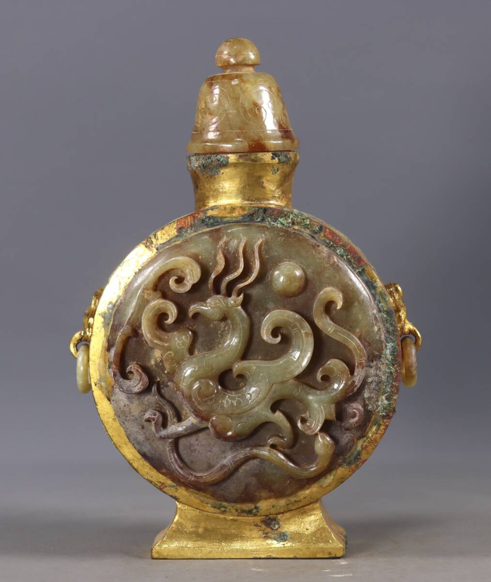 唐物 戦漢時期 青銅 塗金 象眼 和田玉 扁瓶 銅製品 希少珍品 美術品 時代物 D63
