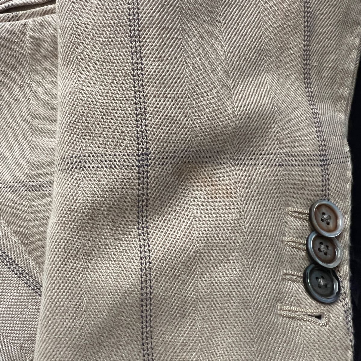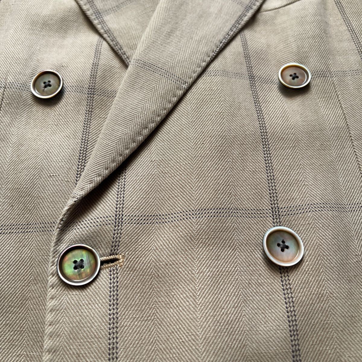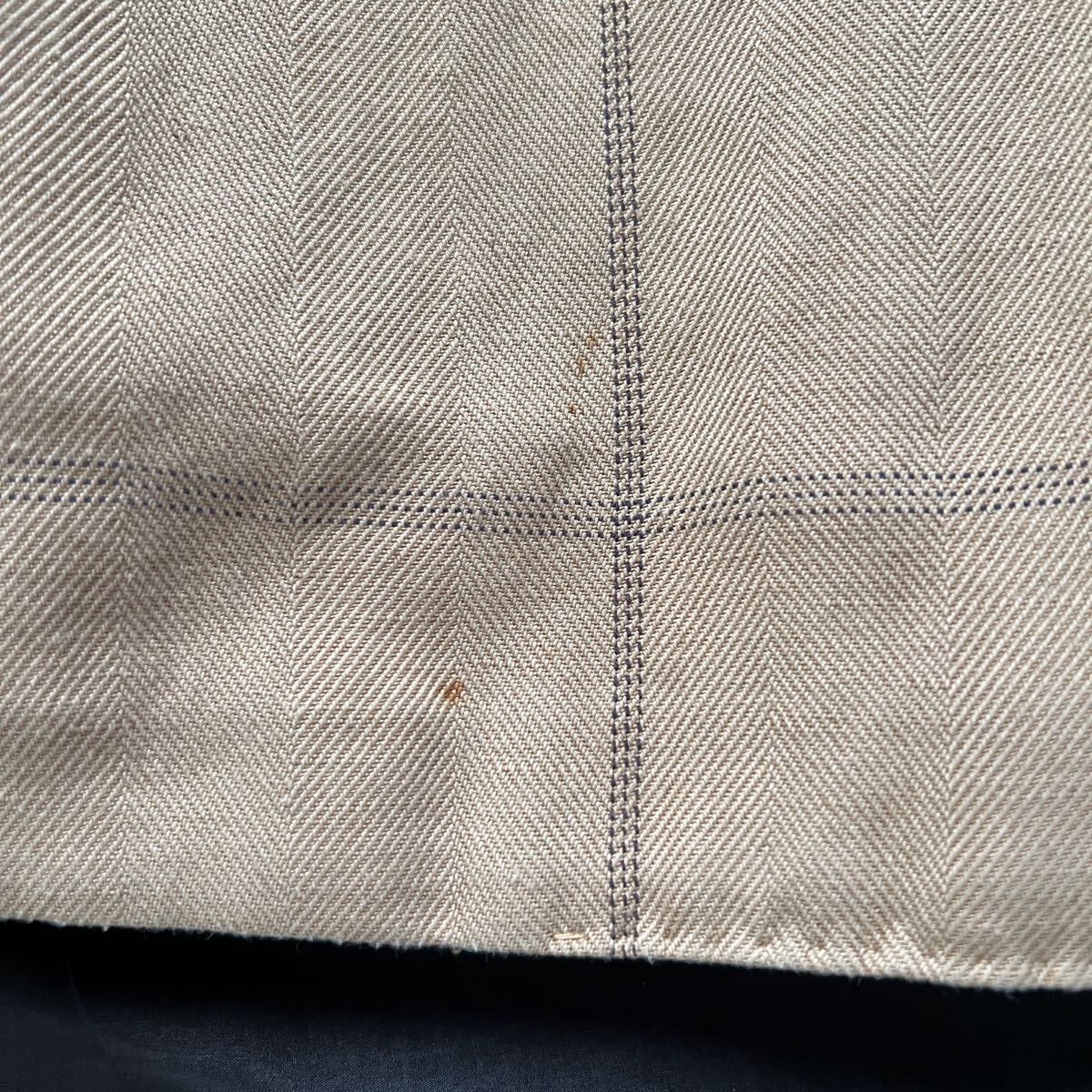 素材はコットン×リネン×ナイロンで、盛夏と真冬を除いてご利用頂けます。また色は薄いベージュベースにチャコールのトリプルラインのウィンドウペーン柄が入りますが、落ち着いているので派手過ぎず、洒落た雰囲気です。