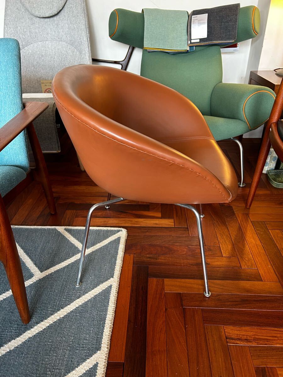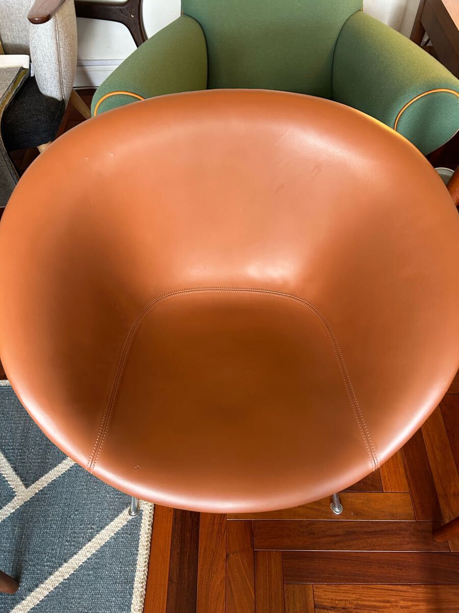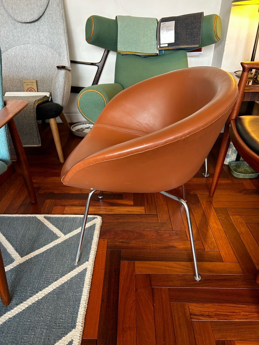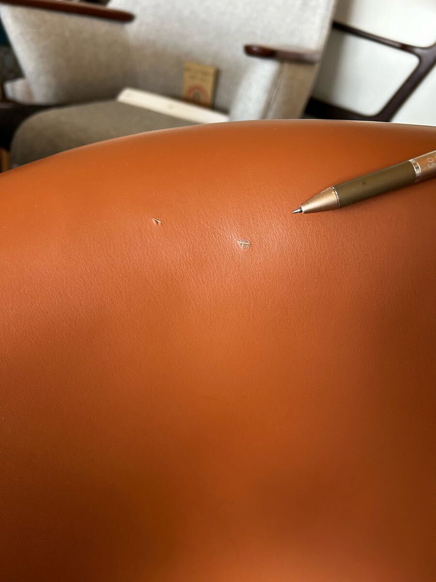1960年代当時のオジナルポットチェアを15年前にコニャックカラーの本革に張替えましてその後店舗展示中に3-11の震災で座面にキズが付いてしまいそのまま14年倉庫で保管してました。そろそろ張替えようか?その前に掲載いたします。内部も新しくしましたので座り心地は良いです。キズ気にしない方には大変良い品物かと思います。