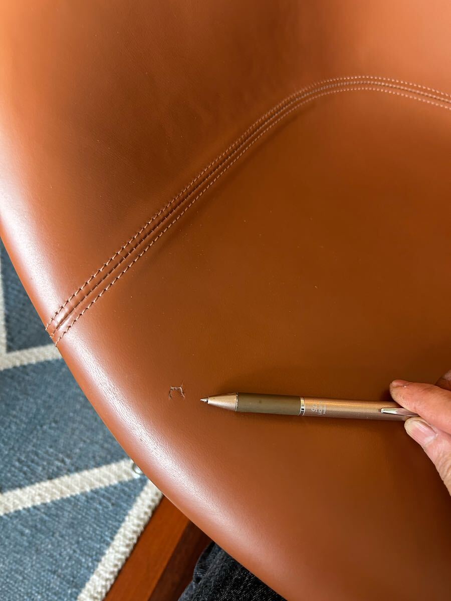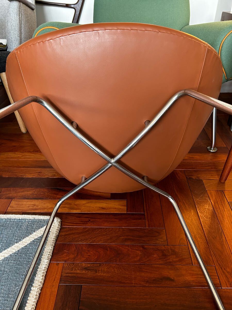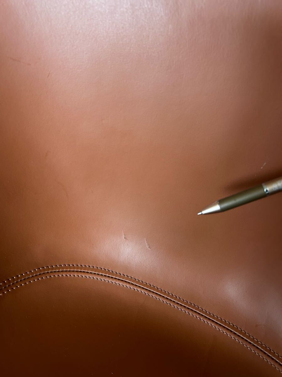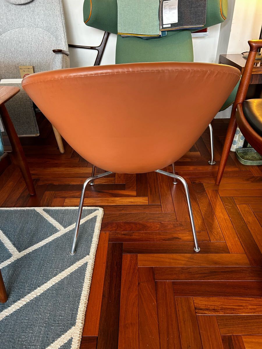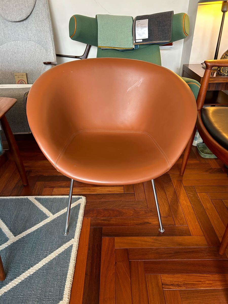1960年代当時のオジナルポットチェアを15年前にコニャックカラーの本革に張替えましてその後店舗展示中に3-11の震災で座面にキズが付いてしまいそのまま14年倉庫で保管してました。そろそろ張替えようか?その前に掲載いたします。内部も新しくしましたので座り心地は良いです。キズ気にしない方には大変良い品物かと思います。