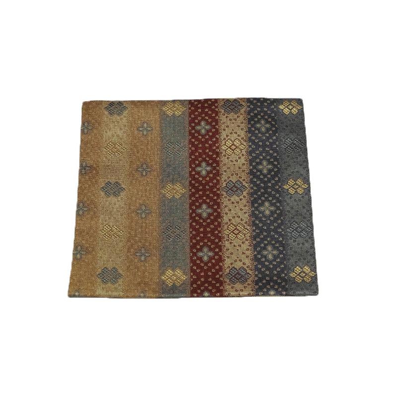 青朽葉色と紅樺色に焦げ茶と藍鼠色などが織り込まれた縦縞模様に霰と小花の地模様が入っています。