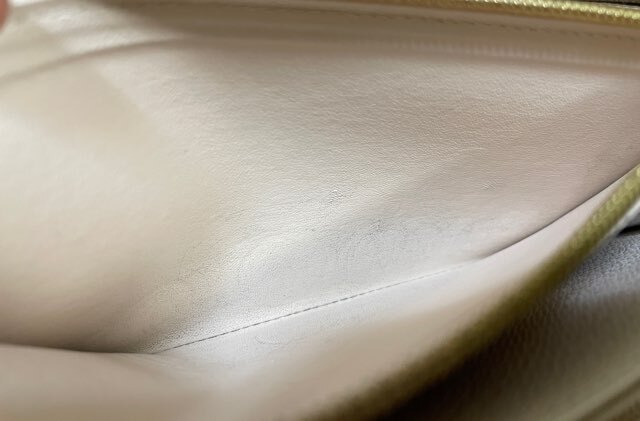 財布縁のコバ剤にスレや剥がれなどがあります。内部には少々の汚れがあり、コインケース内にはコイン跡、画像では確認しにくい薄汚れがあります。