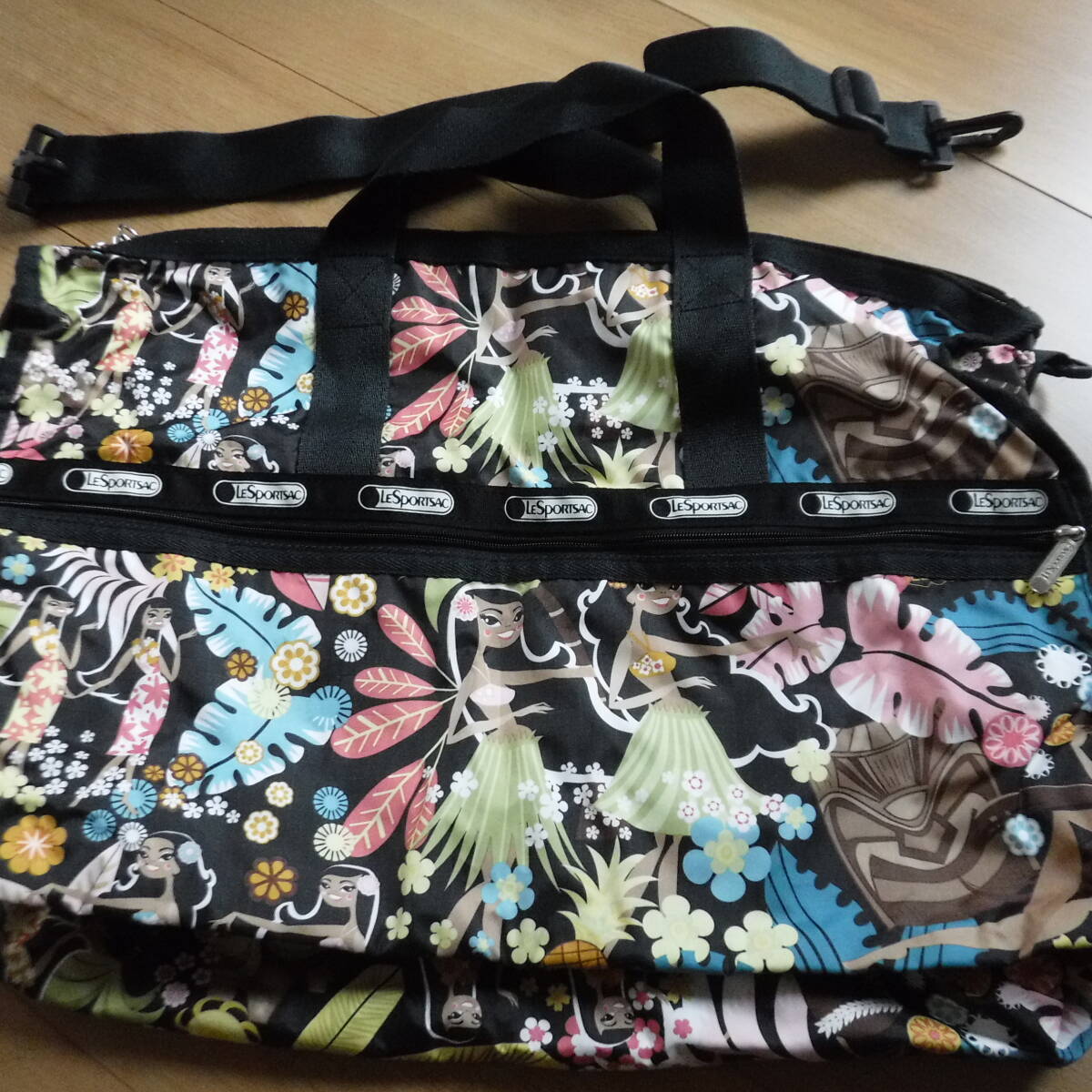 レスポートサックのハワイ限定ワヒネフラのボストンバッグで、サイズは個人寸法で横50縦35マチ25センチ位、トップは両側から開くチャック式(鍵なし)、取り外し&長さ調節可能なショルダーベルトが付いているので、手で持ったり肩から掛けたり斜め掛けにもできると思います☆内側も黒なので汚れが目立ちにくく、4面全てにチャック式大きめポケットがあり便利♪ワヒネフラ柄は数年前にハワイのレスポートサックで販売されており、黒地にフラガールやワヒネ、ヤシの木やプルメリア、ダイアモンドヘッドなどハワイ感たっぷりでとても可愛い柄ですが、今では製造販売されていないはずですので、この状態での入手は困難かと思います。ほとんど使用感なく綺麗な状態ですが画像10のように薄い僅かな傷があります。長期個人保管につき、多少の汚れや擦れ、金具のくすみや傷やシワなどある場合がありますので、ノークレームノーリターンでお願いします!レスポのボストンは結構なお値段がします。