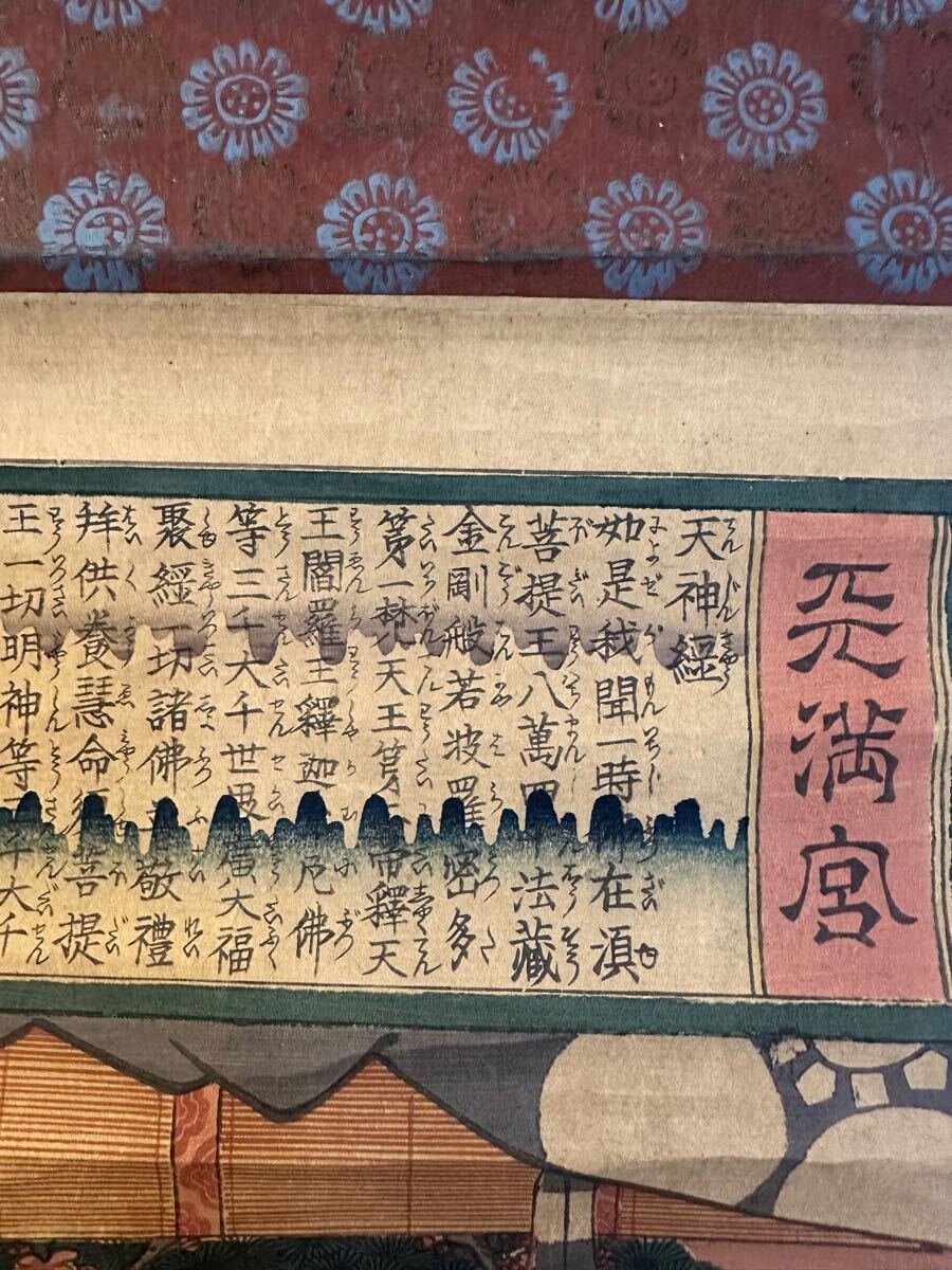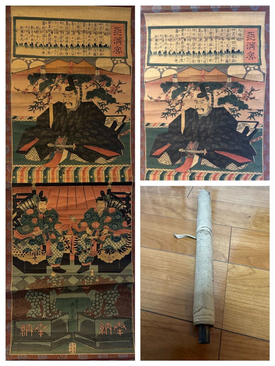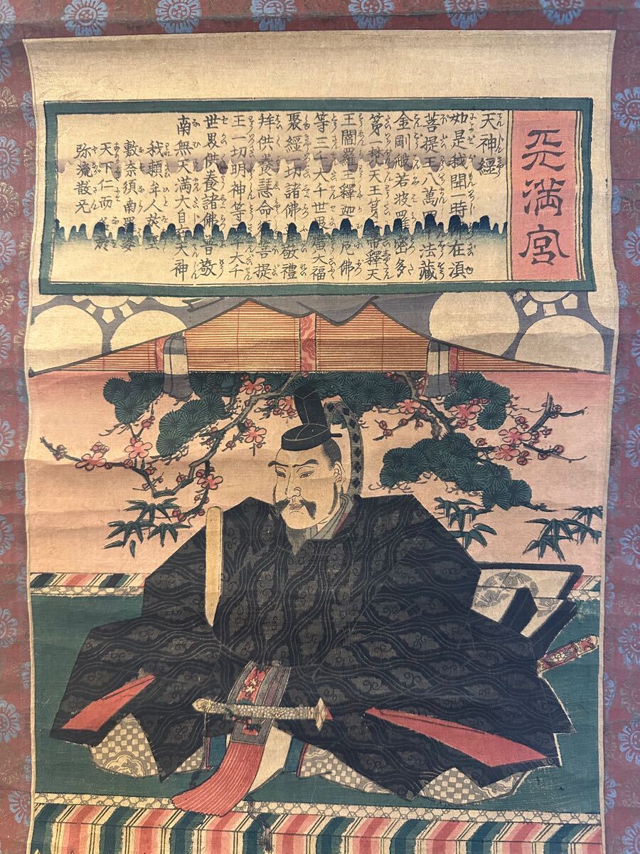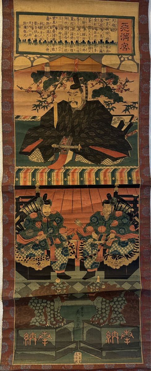 【真作】江戸期 渓斎英泉「天満宮 天神経」古い掛け軸(掛軸) 肉筆 紙本 日本画 浮世絵木板画 人物図 武者絵 画芯サイズ約73*25cm 箱なし