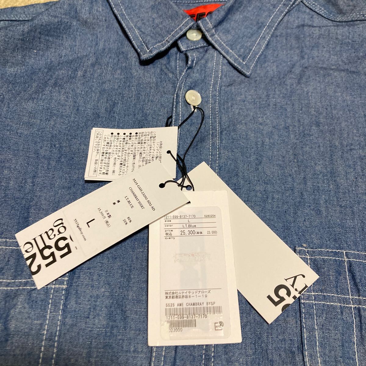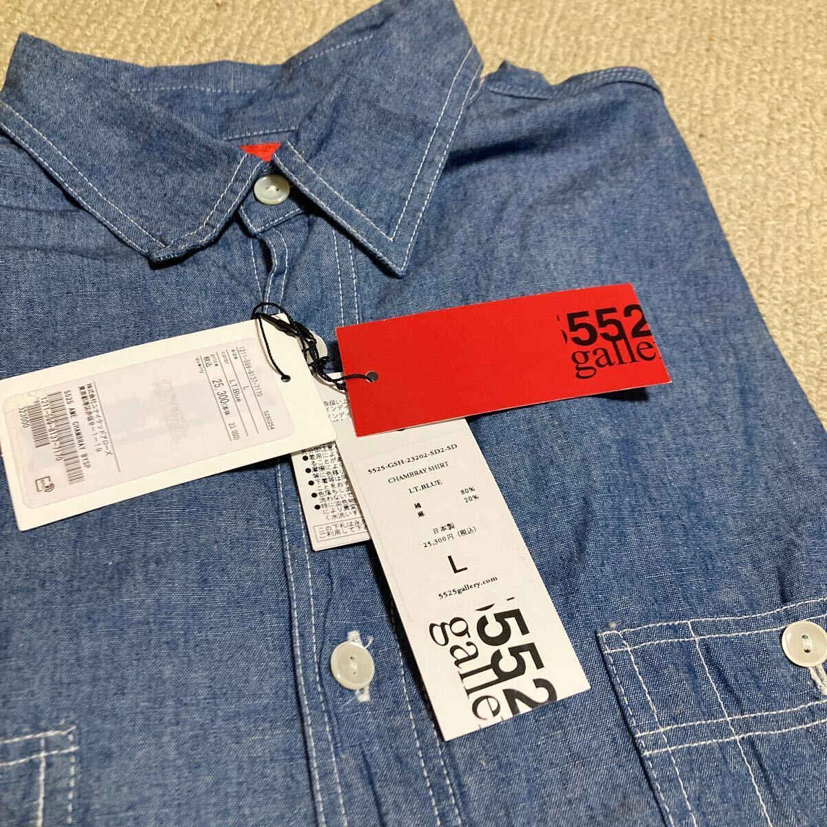 ご存知、ディレクターTITO氏が手掛ける日本のブランド。「日本のモノ作りを世界と」をコンセプトにと立ち上げた5525galleryのシャンブレーシャツ新品未使用です。サイズはL。