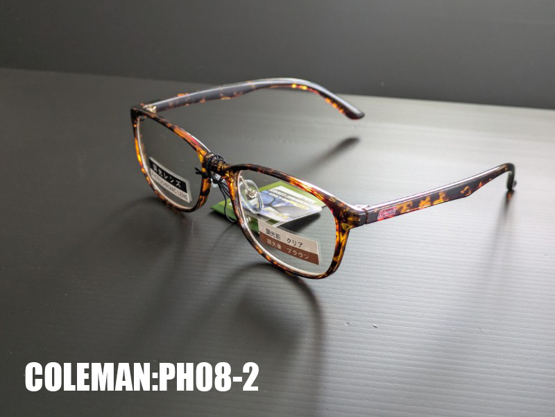 おしゃれなコールマンの2024年の新作。 ブラックフレームに調光レンズの組み合わせです。 レンズは紫外線を浴びると色が変わります。 ウェリントンデザイン?どこか古さを感じながらも質感は抜群です。 調光前はクリア。調光後はスモークにレンズの色が変わります。 べっ甲柄のPH08-1、PH08-3も出品しています。