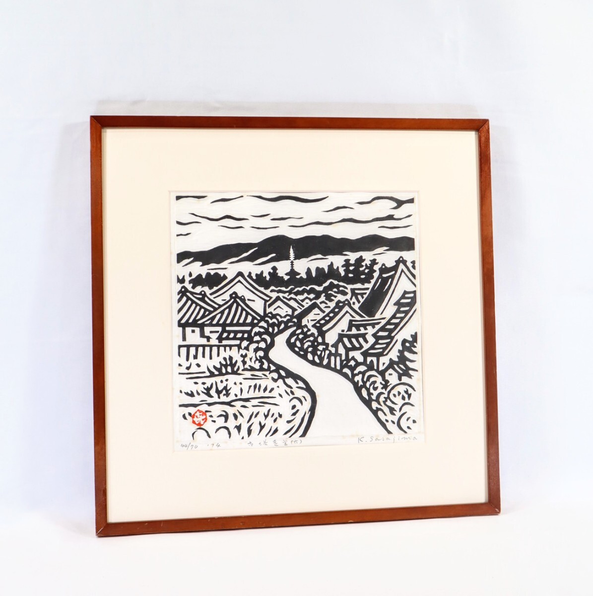 真作 笹島喜平 1974年拓刷木版画「古塔遠望 六」画寸30×30cm 栃木県出身 棟方志功 平塚運一に師事 奈良 春日山を背景に薬師寺五重塔 10610