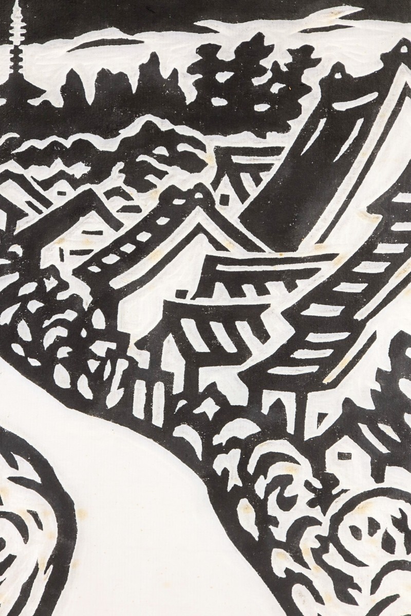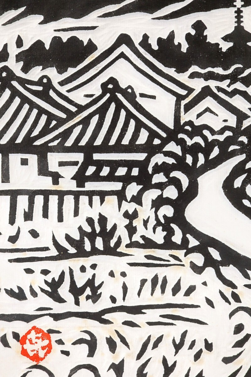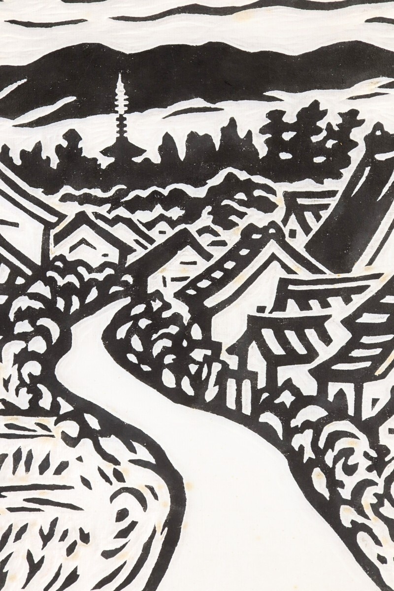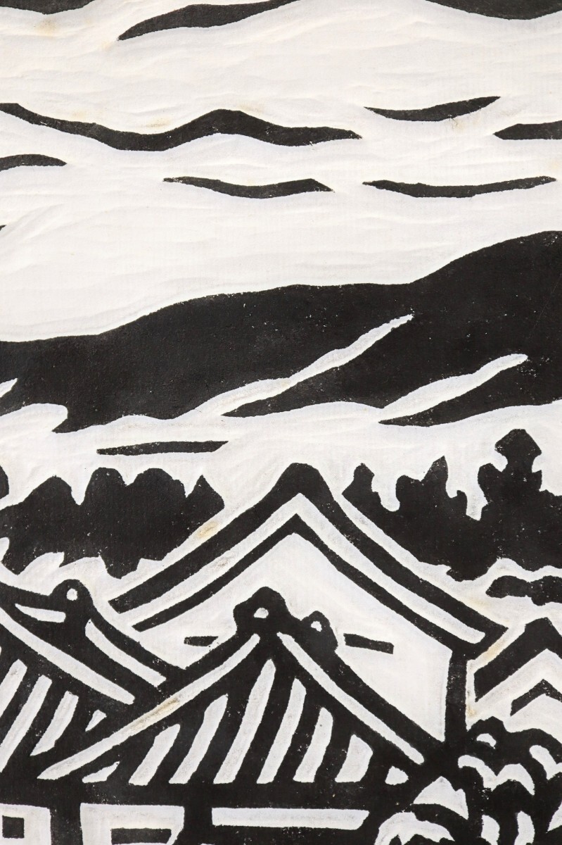 社寺を描くことが多く、白黒の明快な対比、版木の彫痕が
