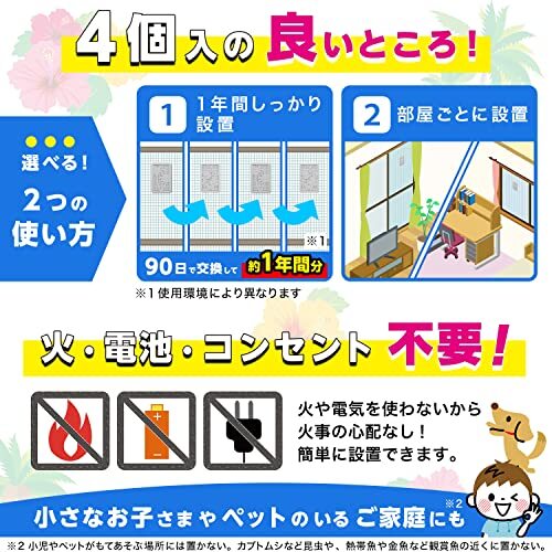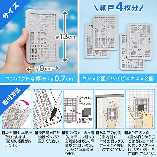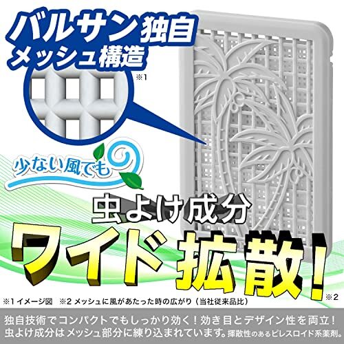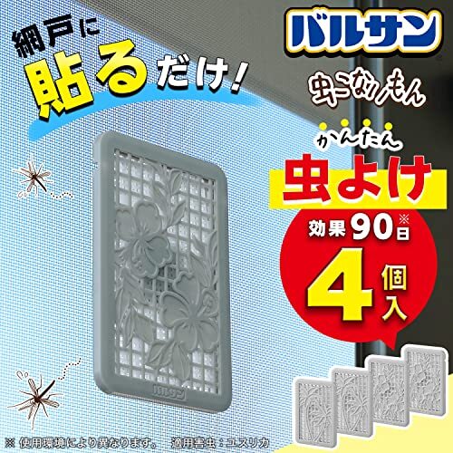 貼るタイプ・グレー 1個 (x 4) ・・Style:貼るタイプPatternName:アミ戸用・面ファスナーで網戸に貼るだけの簡単虫よけ。・バルサン独自のメッシュ構造で少ない風でも虫よけ成分がワイドに拡散します。・網戸4枚分、4個入りです。網戸につけて目立ちにくいライトグレーです。・雨に濡れても薬剤の拡散に影響せず屋外で使えます。無臭タイプ。・シーズン毎に設置&アミ戸4枚分でしっかり虫よけ。商品紹介 ●屋内外の境界線である網戸周りを虫よけすることで、お部屋へのいやな虫の侵入リスクを下げる。 ●少ない風でも虫よけ成分ワイド拡散の独自メッシュ構造でしっかり虫よけ。 ●網戸に設置していても、虫よけ感が目立ちにくい、ヤシとハイビスカスのデザインモチーフ。 ●網戸に馴染むグレーの色彩。 ●揮散性のあるピレスロイド系薬剤。 ●90日4個入りなので、いやな虫が増えているシーズンに、屋内外の境界面の網戸に網羅的に設置可能。 ※1か所に繰り返し設置し虫よけも可能 ●パッケージ記載のQRコードから使用開始登録をすれば、交換時期を自動メールでお知らせ。