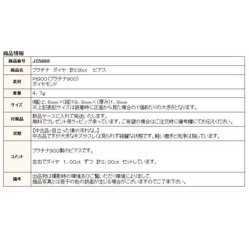 | 商品名 | プラチナ ダイヤ 計2.00ct ピアス |