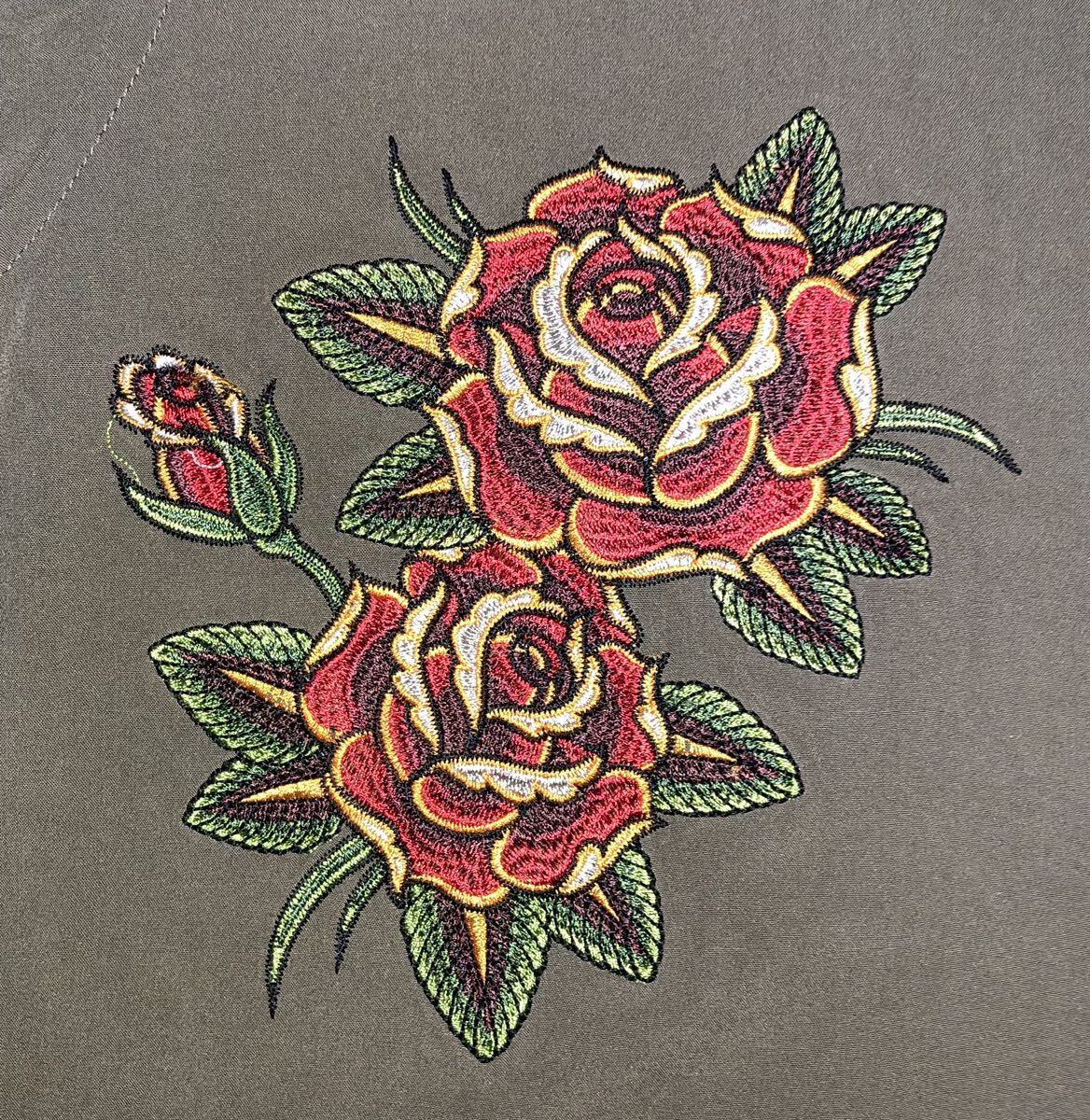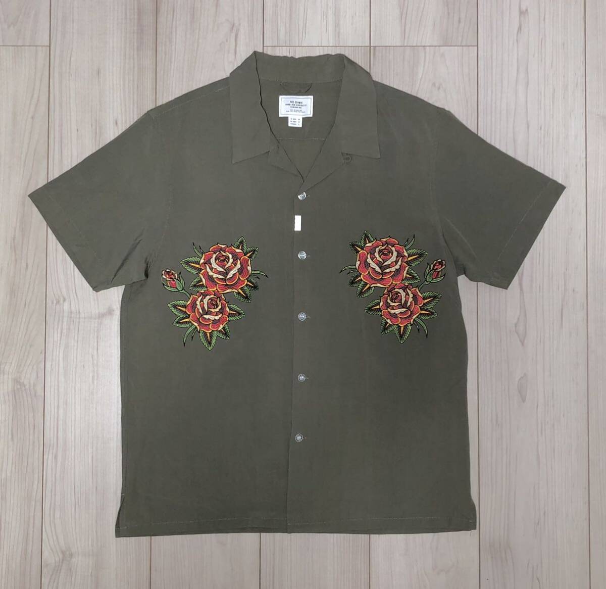タトゥーテイストのバラの刺繍が両胸を飾り、ストリートな不良感と色気のあるオープンカラーの半袖シャツになります。