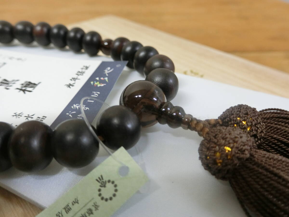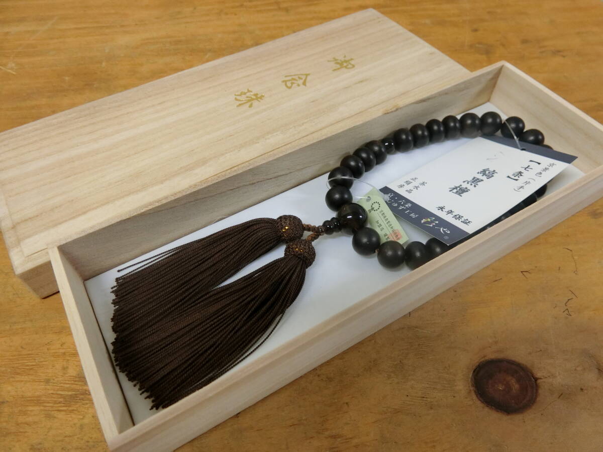 豪華桐箱入り縞黒檀/茶水晶のお数珠です。