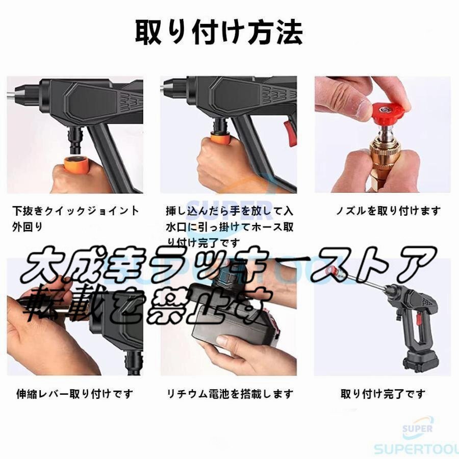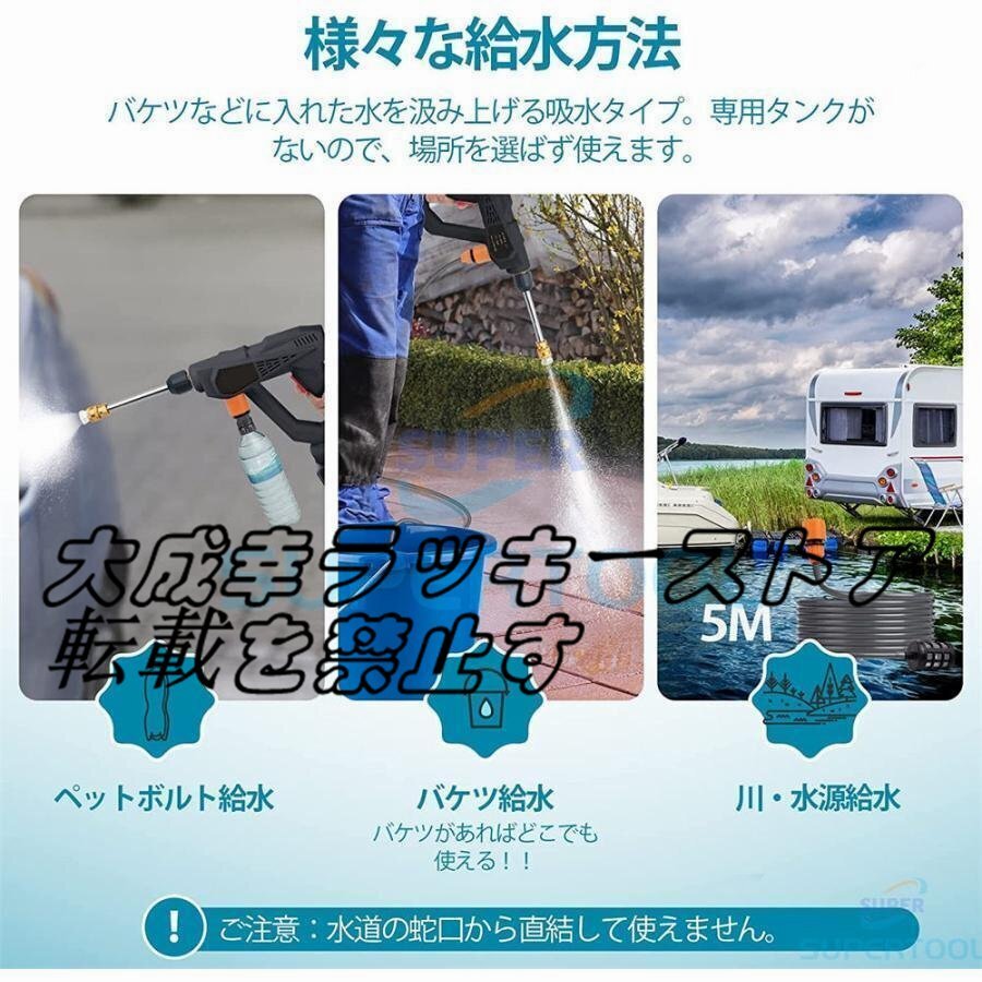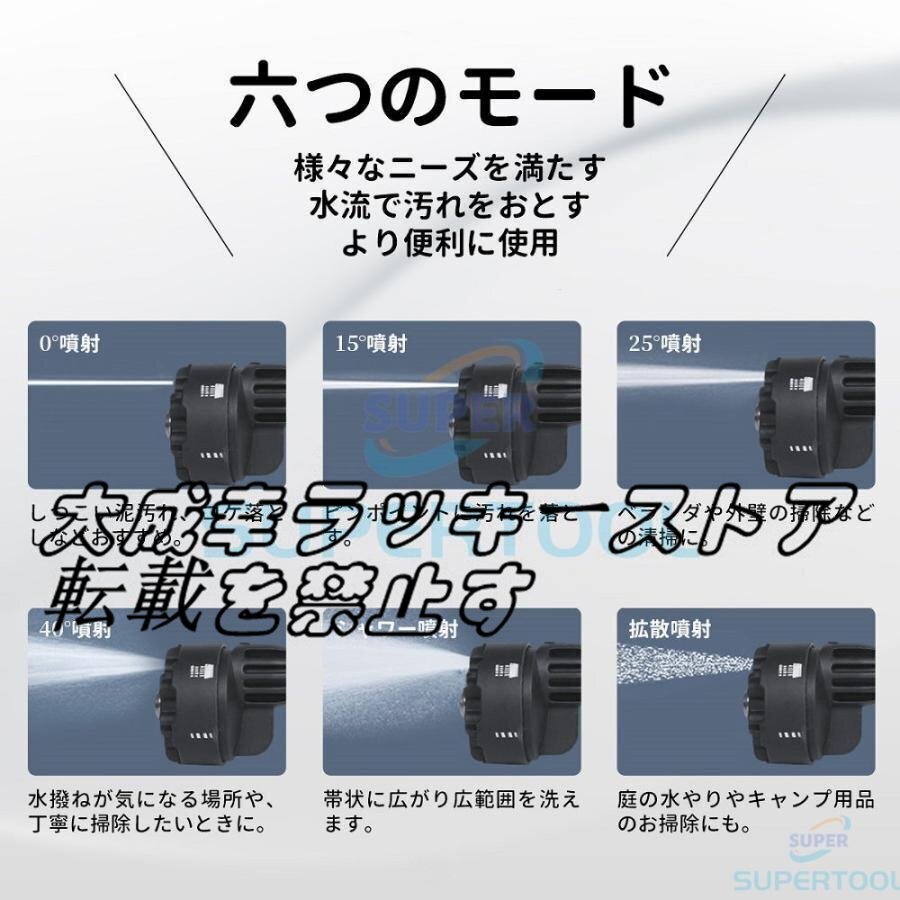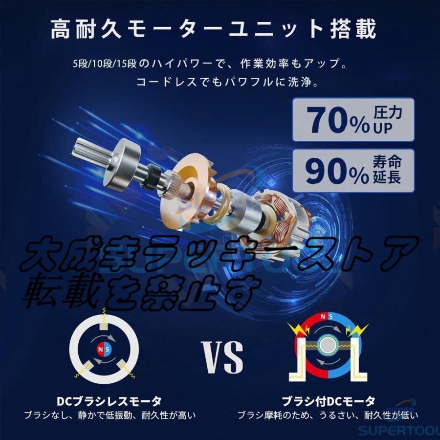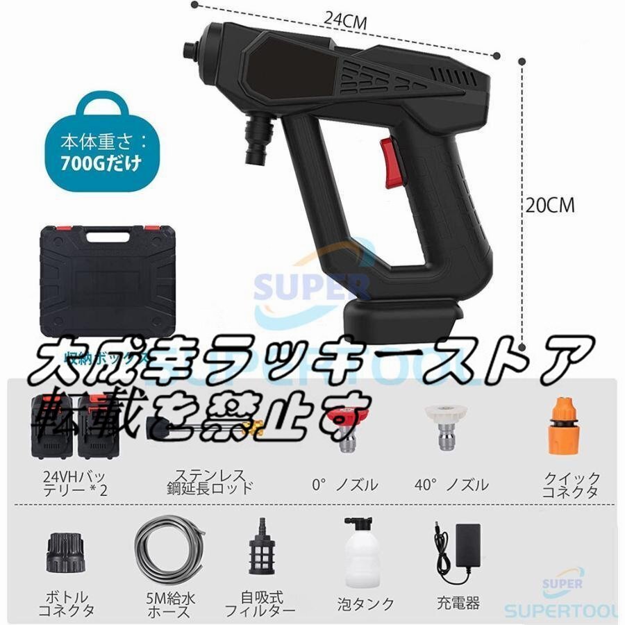 同梱内容:本体*1、バッテリー*2、充電器*1、0°ノズル*1、40°ノズル*1、ステンレス綱延長ロッド*1、、クイックコネクタ*1、ボトルコネクタ*1、5M給水ホース*1、自吸式フィルター*1、収納ケース*1