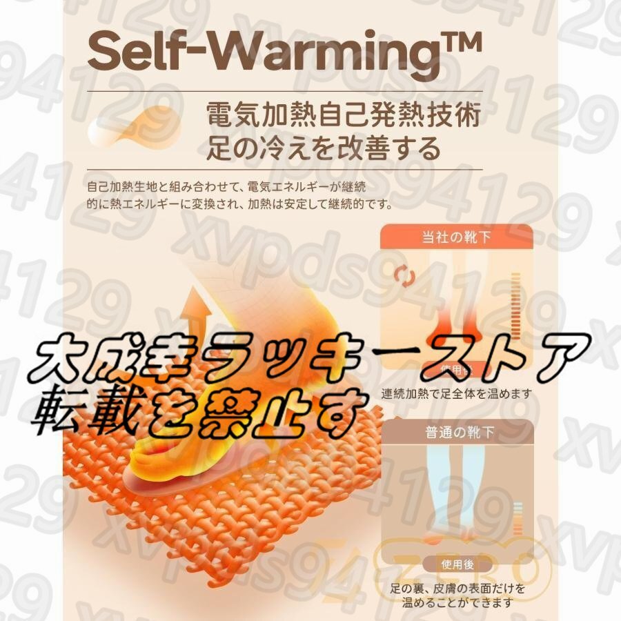【充電式電熱ソックス】電気加熱自己発熱技術を搭載し、電気エネルギーを熱エネルギーに継続的に変換し、安定した継続的な加熱を実現します。電池靴下の両側の収納ポケットに配置されています、異物感などの不快感がなく、より効果的な加熱性能を実現して、寒い季節に足を暖かく保ち続けます。