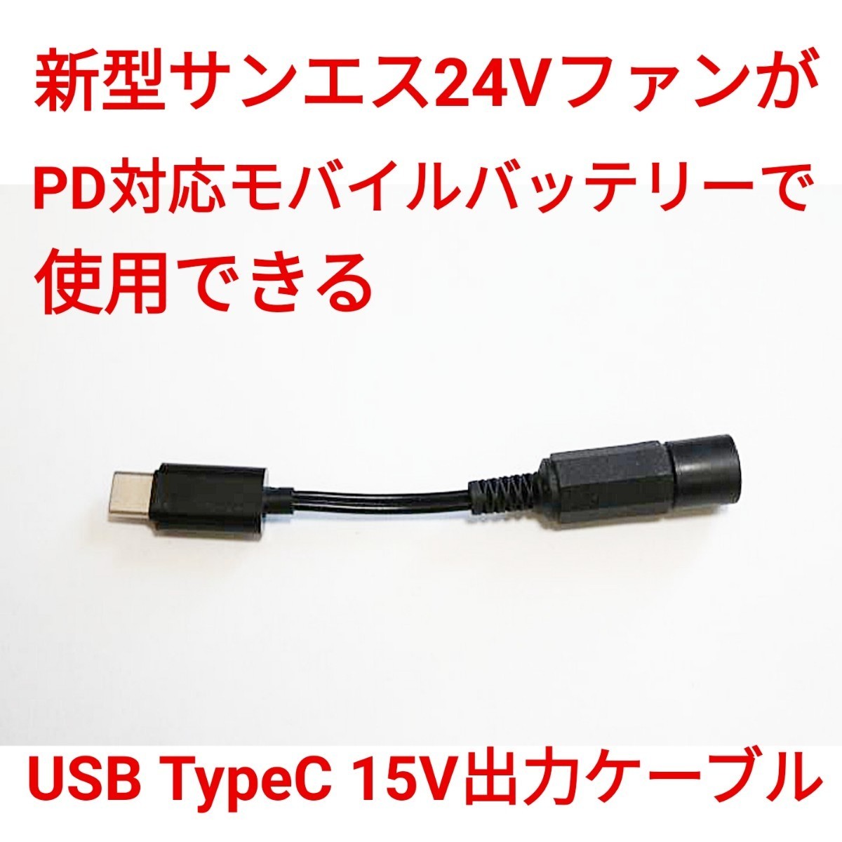 PD対応モバイルバッテリーで新型サンエス24Vファンを使用できるケーブルです。