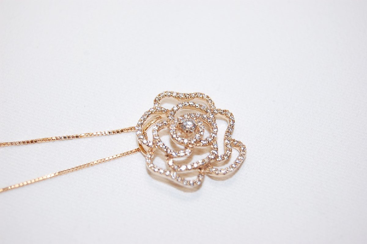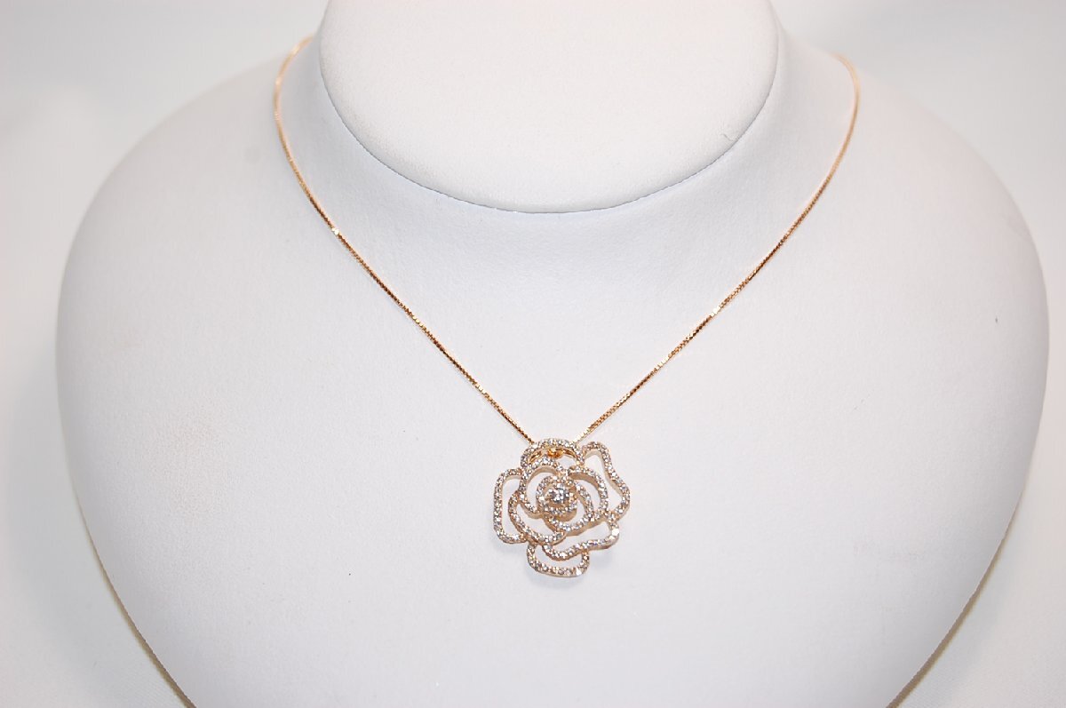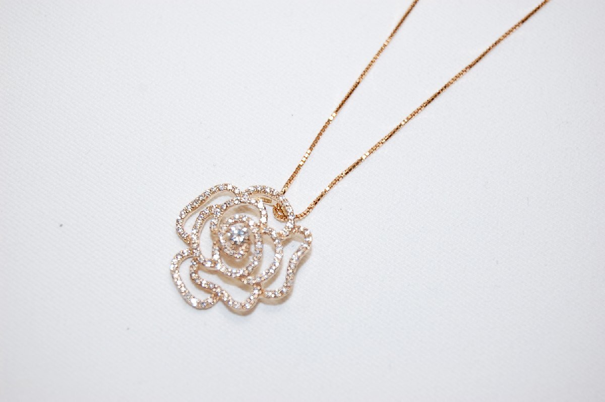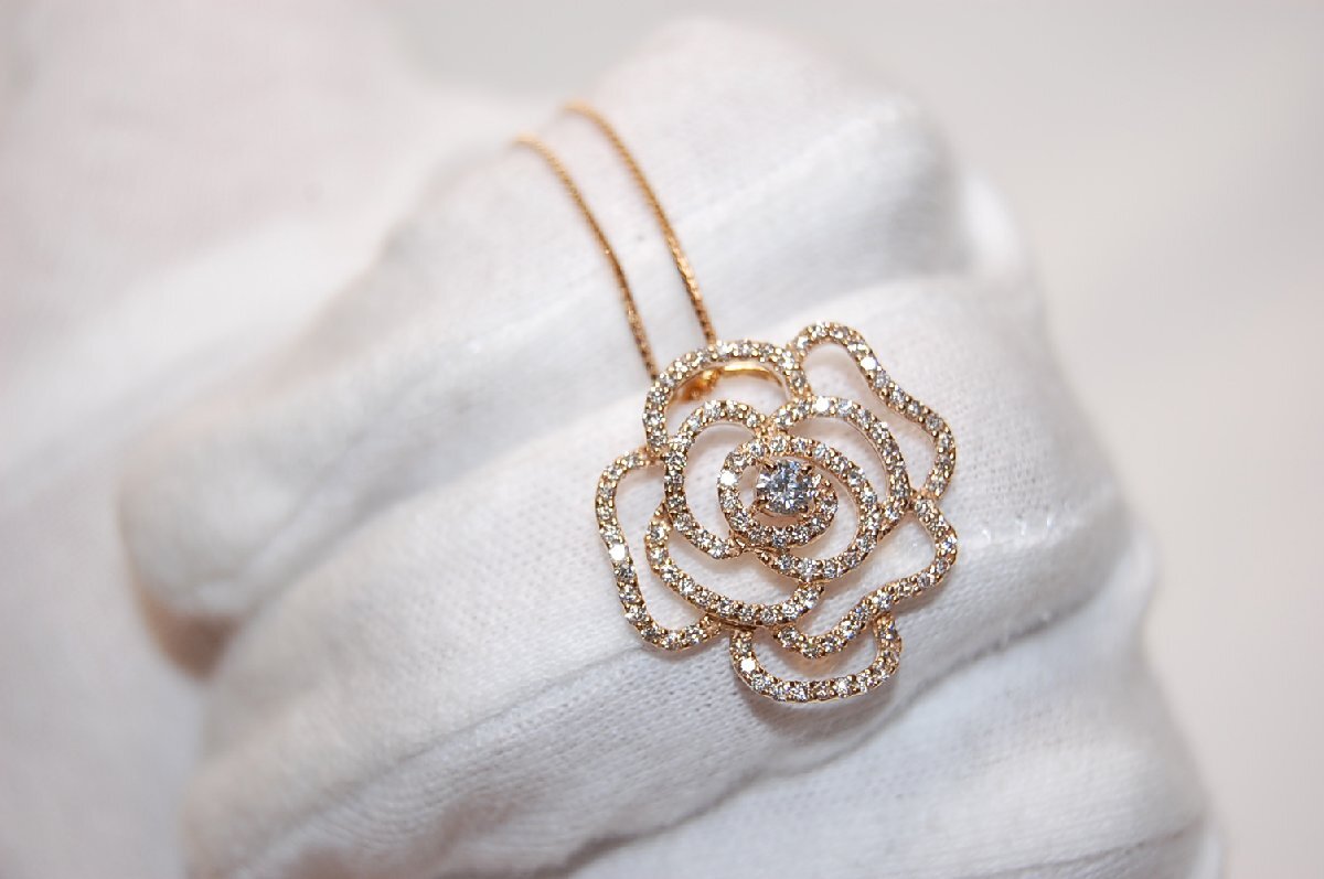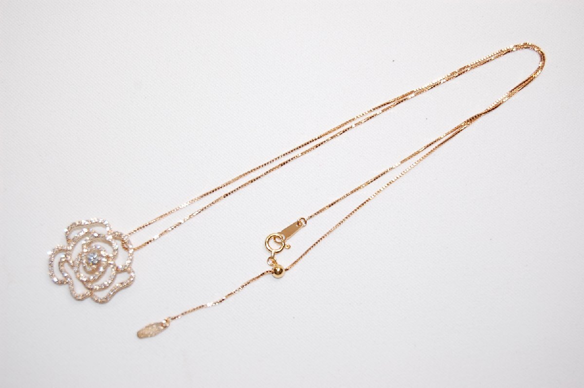 【商品名】K18 ピンクゴールド バラモチーフ ダイヤモンド ネックレス 0.70ct 【素材】K18xダイヤモンド 【サイズ】ペンダント約W20mmxH20mm。チェーンの長さ最長約44cm(スライドアジャスターチェーンなので自由に長さ調整が出来ます) 【色】ピンクゴールド 【商品ランク】中古A 【付属品】無し 【備考】K18表面に若干の小傷あり。ダイヤモンドの内包に傷や不純物あり。ダイヤモンド0.70ct。重量5.1g。