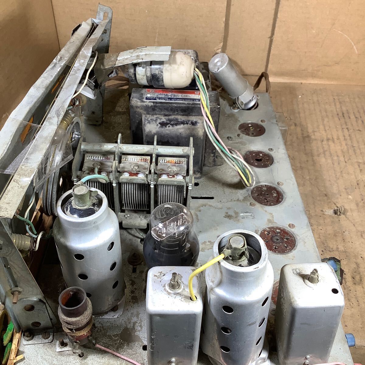商品]昭和レトロな家電品真空管ラジオ木材の外装は、ほぼ無いですが古い電子部品が見えてる状況品です。