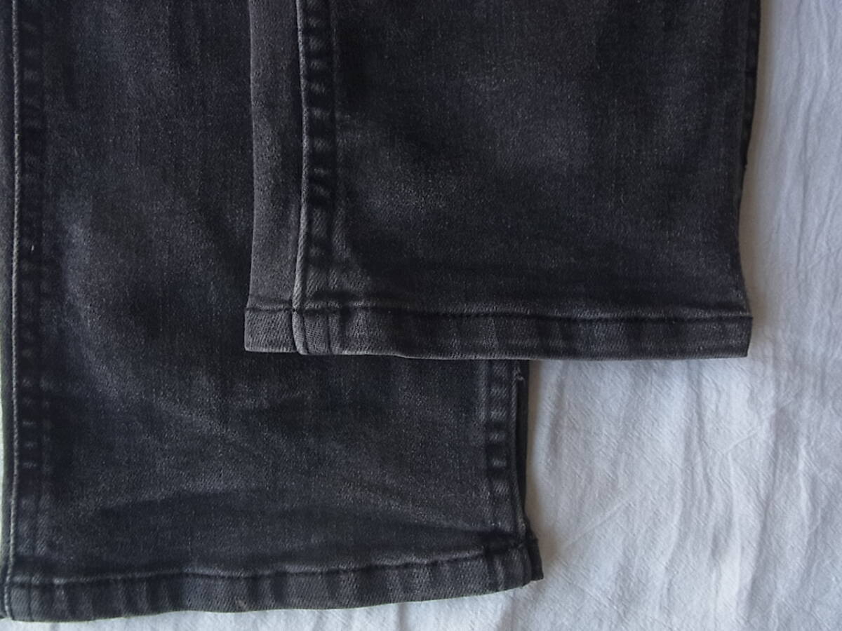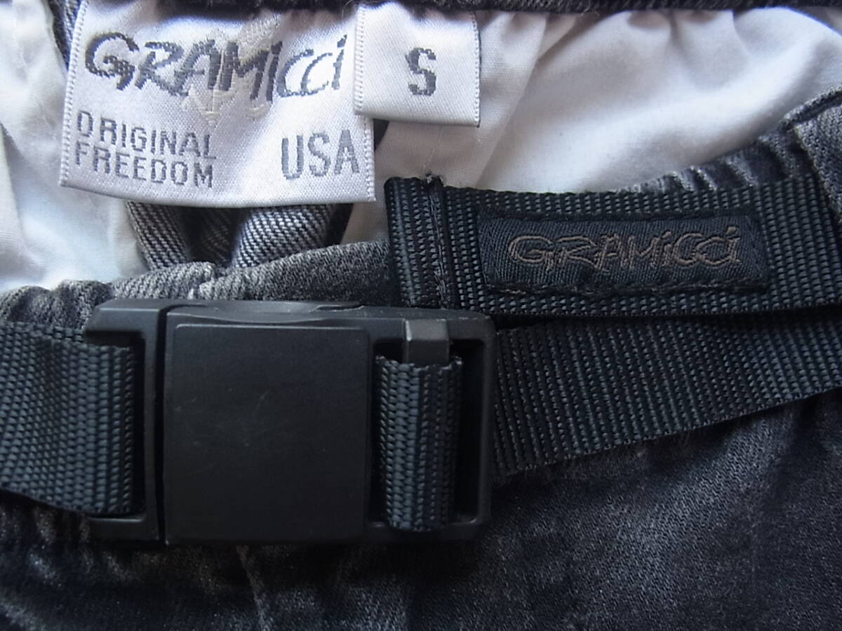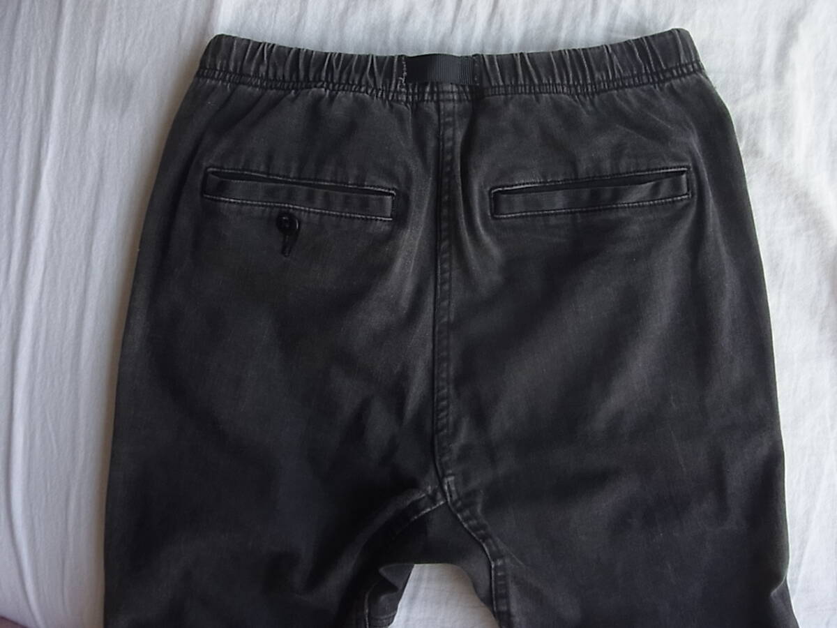 グラミチのストレッチブラックデニムでユーズド加工、スリムシルエットのクライミングパンツになります。USEDで着用感と多少の色褪せ、右膝部分に9枚目の画像の様な糸飛びした箇所が御座います。それ以外には特に目立ったダメージ等は御座いません。