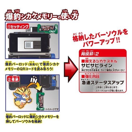 ■商品説明: 爆釣バーハンターより、格納したバーソウルをパワーアップできる「爆釣シカケメモリー サビサビライン」が登場! 爆釣バーロッドに爆釣シカケメモリーを挿して格納! シカケスキル「サビサビライン」を覚えると、糸にサビの力を与え、ライフ属性に大ダメージを与えることができる! 【セット内容】 爆釣シカケメモリー サビサビライン (本商品に付属するもの以外すべて別売りです。) ※本商品は爆釣バーロッド(別売り)の専用商品です。この商品だけで遊ぶことはできません。 ※QRコードは株式会社デンソーウェーブの登録商標です。 ■メーカー:バンダイ |