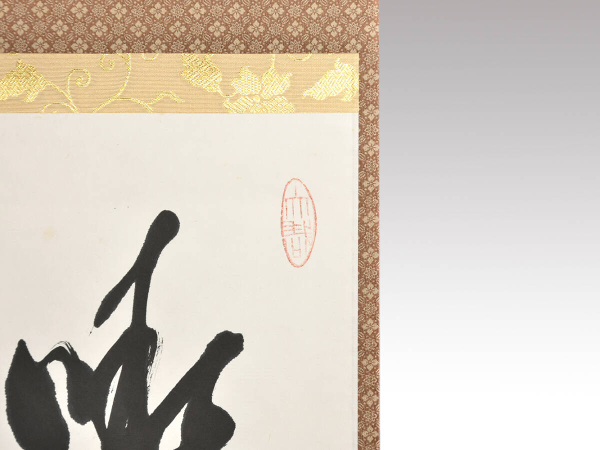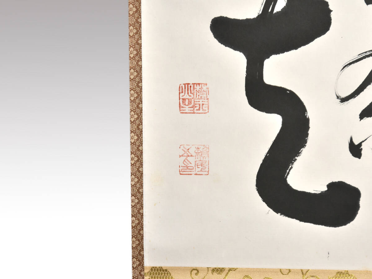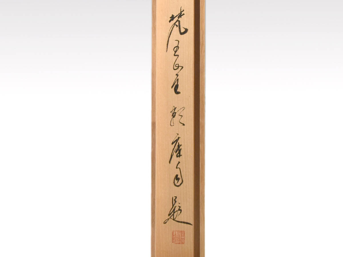 【真作】横物軸 相国寺 有馬頼底「喫茶去」共箱 墨蹟 臨済宗です。 喫茶去は中国唐代の禅僧、趙州従しん(じょうしゅうじゅうしん)の言葉として有名です。 もともとは「お茶を飲みに行け、お茶を飲んで目を覚まして来い」の意味で、相手の怠惰を叱責する言葉でした。 後には「お茶を召し上がれ」の意味に解釈され、お茶を飲むという日常の中に深い覚りのはたらきを見るという意味にとらえられるようになりました。 わずかに糊シミが出ておりますが全体的に良い状態です。 表具は一文字、竹屋町裂 中回し、緞子の良い表具です。 ※撮影の際に生じた写り込みなどがございます。 ご理解の程よろしくお願い致します。 |