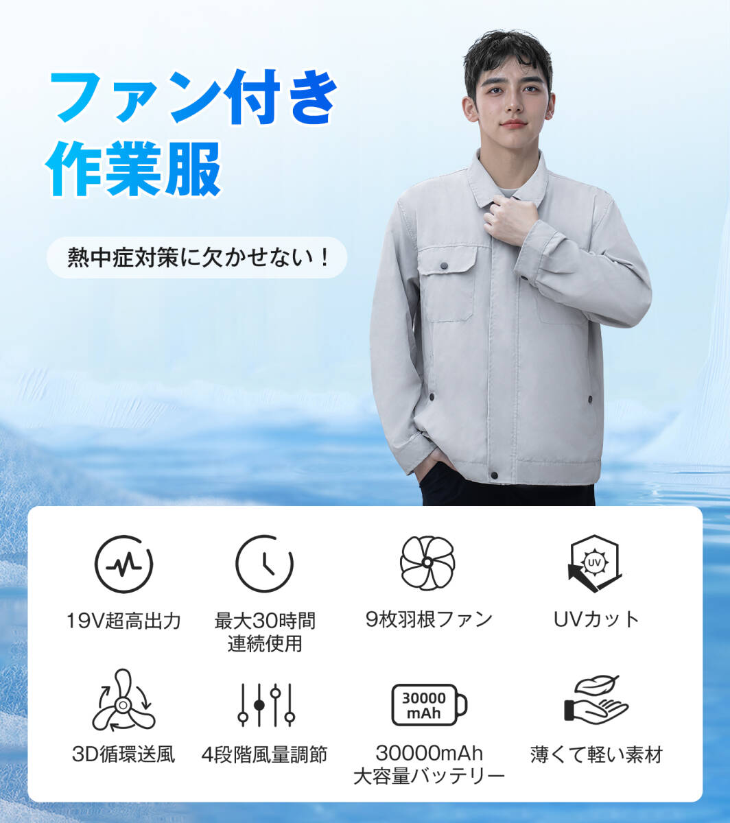 空調服 空調作業服 長袖 30000mAhバッテリ付 グレー 2XL 4段階風速調節 最大26時間稼動 USB給電 UVカット 男女兼用