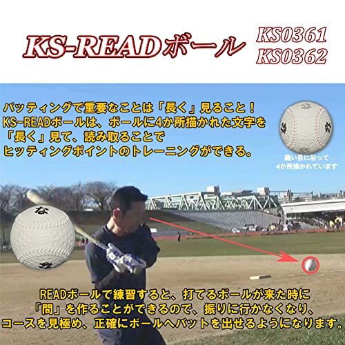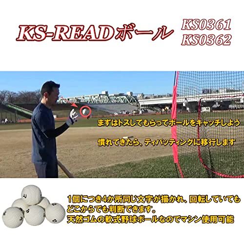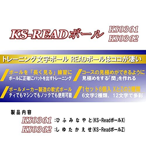 「バッティングトレーニングボール KS-READ(リード)ボール1P 「え」 文字ボール 動体視力トレーニング」▼4944074011165▼(商品説明)・ホワイト KS0362-E・ボールの文字を読み取ることでヒッティングポイントのトレーニングができる軟式野球ボール・「間」を作ることができるようになり、正確にボールへバットを出す出す練習ができます。・材質:天然ゴム(軟式野球ボール)・直径:約70mm 重量:約135g・内容:1個入り 文字/えバッティングで重要なのは「長く見る」こと! KS-READボールは、ボールに4か所描かれた文字を 「長く」見て、読み取ることで ヒッティングポイントのトレーニングができます。 リードボールで練習すると、打てるボールが来た時に 「間」を作ることができるので、突っ込んで振りにいかなくなり、 コースを見極め、正確にボールへバットを出せるようになります。 1個につき4か所同じ文字が描かれ、回転していてもどこからでも判断できます。 天然ゴムの軟式野球ボールなので、マシン使用可能です。 ※印刷されている部分にバットが当たるとバットに色が付く場合があります。ご注意ください。 気になるようでしたら、練習用のバット等をご使用いただくようお願いいたします。 練習用バット等もございます トレーニング文字ボール READボールはここがすごい! ボールを「長く見る」練習に:ボールに正確にバットを出すトレーニング コースの見極めができるように:見極めをする「間」を作れるように ボールメーカー製造の軟式ボール:ティでもマシンでもノックでも使用可能 お試しに最適1個 文字は「え」 全部で12文字ご用意してます。