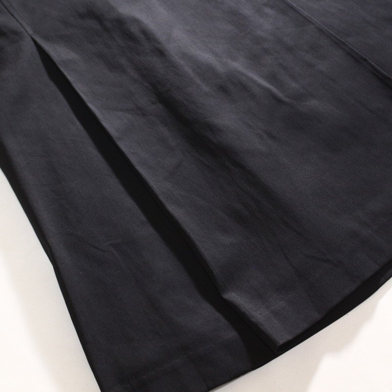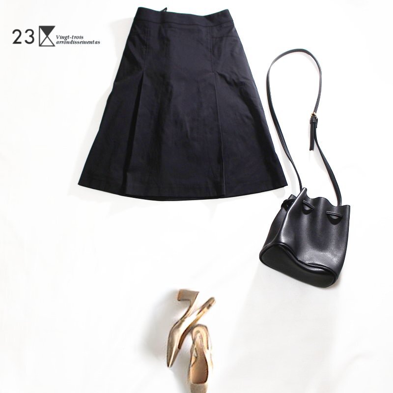 ハリ&ストレッチコットン生地、タイトめ緩やかAライン、ファスナーは前中央、シンプルな定番デザインです。