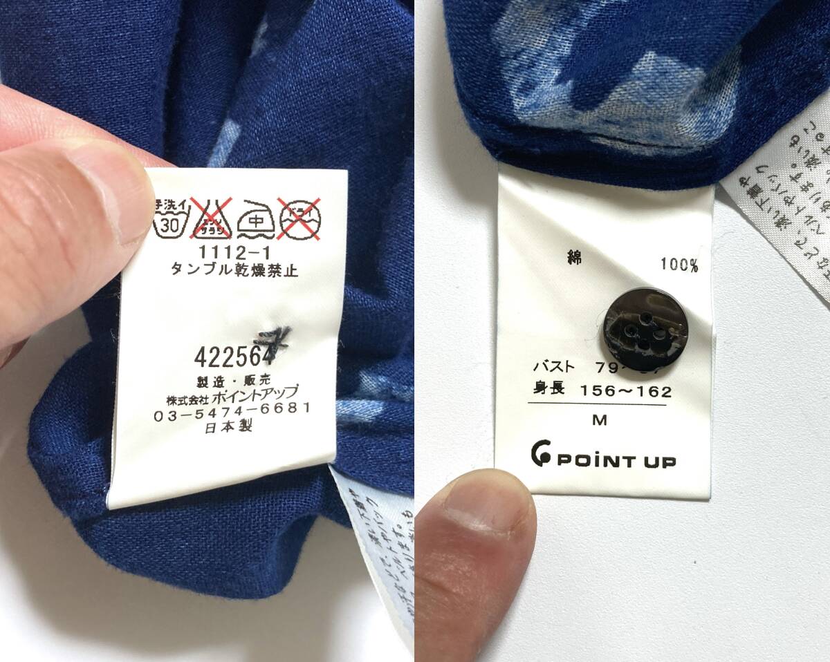 | コメント | 80年代から90年代頃のものと思われます。株式会社ポイントアップ取り扱い。日本製。エリはレギュラーカラーにヒモ付き、フロントのボタンは斜めに付いたデザインになります(スソも少しズレた感じになっています。写真6枚目)。ポケットは無し。シルエットはスソが広がった感じになっています。インディゴ染めのガーゼ生地がとても良い雰囲気です。他にも色々なブランドのレディースのアイテムや、その他いろいろなアイテムを出品しています。よろしければご覧ください。 |