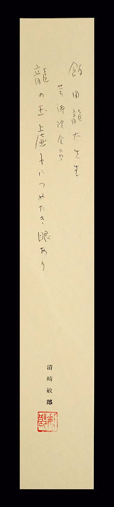 紙本肉筆未装短冊1葉 作品寸法:36.2cm x 6.0cm 紙背に清崎敏郎蔵印及び自筆書込み 商品状態:非常に良好な保存の美品です。 飯田龍太(いいだりゅうた) 1920―2007。俳人。山梨県生まれ。父は俳人の飯田蛇笏(だこつ)。国学院大学卒業。1941年(昭和16)より作句、1947年に『雲母(うんも)』の編集担当。1962年蛇笏の没後、『雲母』を継承し、主宰として優秀な俳人を輩出した。山梨県境川村(現、笛吹(ふえふき)市)に根をおろし、自然と向き合いながら感性豊かな作品をつくり続け、昭和俳句を代表する俳人として独自の作風を確立し、俳壇内外の高い評価を得るに至った。1992年(平成4)突然『雲母』の終刊を宣言して事実上俳壇から引退し、以後作品を発表しなかった。1957年第6回現代俳句協会賞、1969年第4句集『忘音』により第20回読売文学賞、日本芸術院賞恩賜賞などを受賞。日本芸術院会員。句集に『百戸の谿(ひゃっこのたに)』(1954)、『忘音』(1968)、『今昔』(1982)、『山の影』(1985)、『遅速』(1991)など。随筆集『無数の目』(1972)など。 出典:日本大百科全書(ニッポニカ) 清崎敏郎(きよさきとしお) 1922-1999。昭和-平成時代の俳人。大正11年2月5日生まれ。高浜虚子,富安風生に師事し,「ホトトギス」同人。昭和54年風生の没後は「若葉」主宰をつぎ,花鳥諷詠と客観写生の理念をつらぬいた。平成10年「凡」で俳人協会賞。母校慶大の講師,同大付属高教諭をつとめた。平成11年5月12日死去。77歳。東京出身。本名は星野敏郎。句集に「安房上総(あわかずさ)」「東葛飾(かつしか)」など。 出典:講談社『デジタル版 日本人名大辞典+Plus』 |