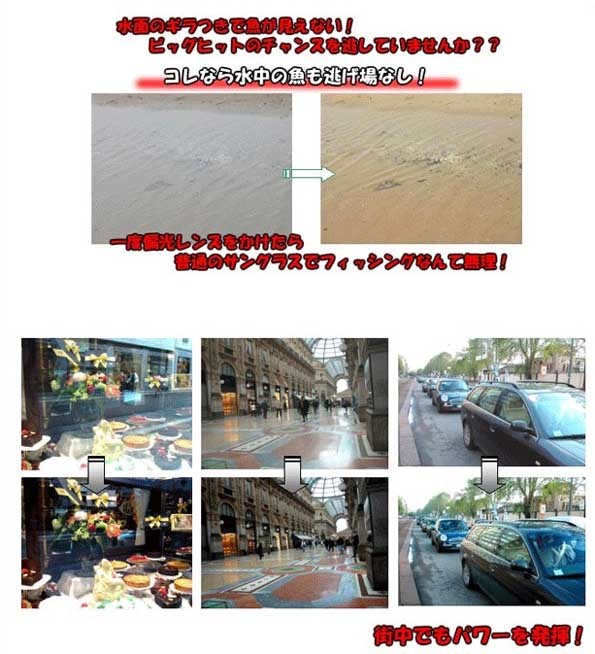 ※いつものメガネに装着するだけです♪手元を見るときは跳ね上げ、水面を見るときは、下げるだけ!♪ まぶしくはないけれど、視界が“不透明”というんじゃ、 サングラスの意味がない。 目の疲労も少なく、紫外線もほぼ100%カット!! |