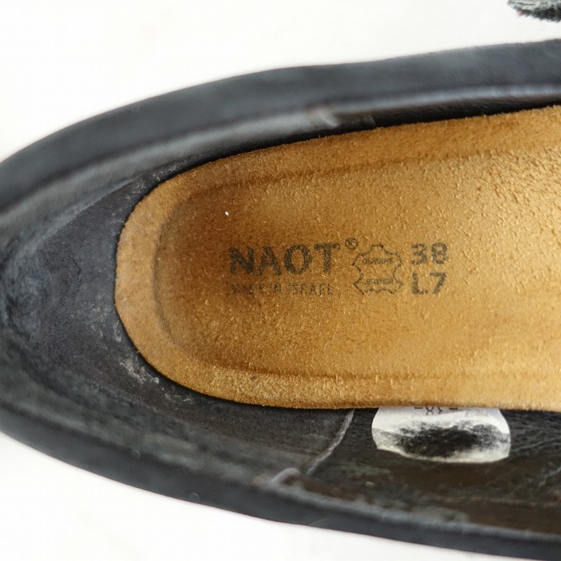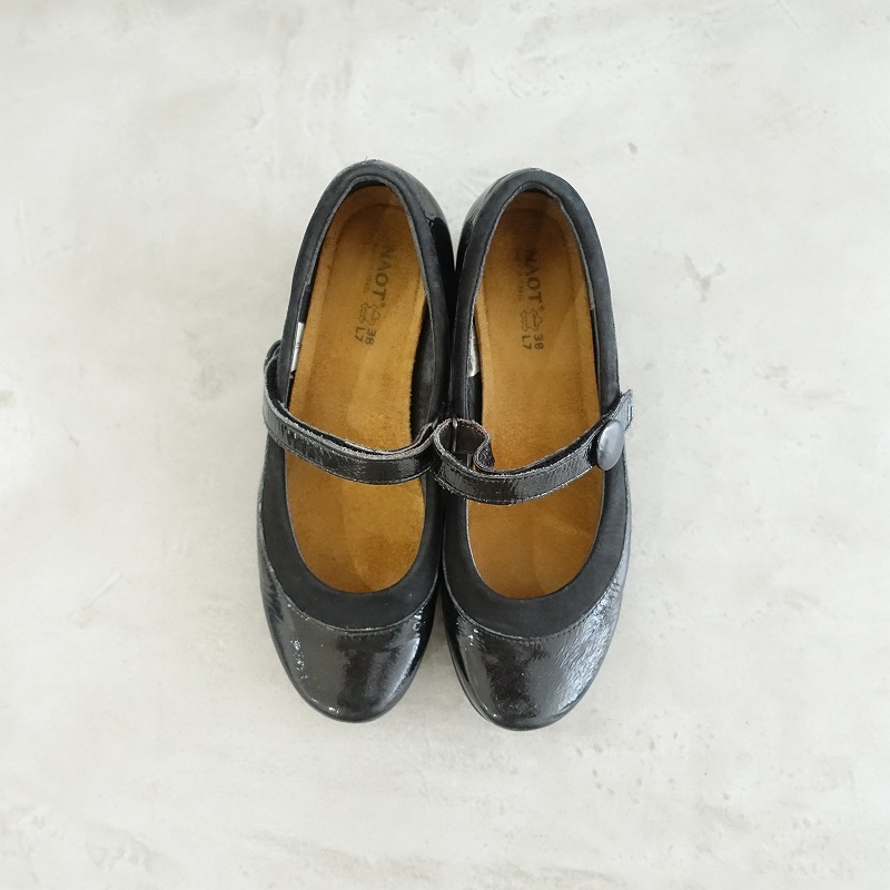 NAOTのLATEST レイテストです。カラーはブラックです。アッパーはエナメルレザーとヌバックレザーが切り替えられたデザインです。ストラップはベルクロタイプで、着用時にフィットしやすくなっております。インソールはスエードレザー素材で、クッション性がございます。定価(メーカー希望小売価格)27,500円の商品です。 |