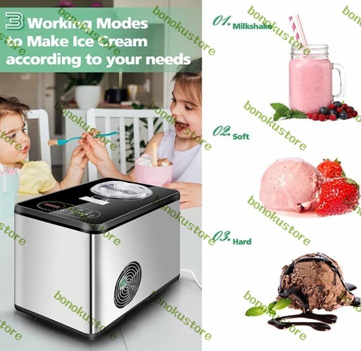 【多彩なフレーバー設定】:このアイスクリームメーカーの3つのモード設定でフレーバーの世界を探索し、ミルクシェイク、ソフトアイスクリーム、ハードアイスクリームのオプションを提供します。フローズン ヨーグルト、シャーベット、アイスクリーム、シャーベットなど、あらゆる味覚に合うさまざまなお菓子を作るのに最適です。